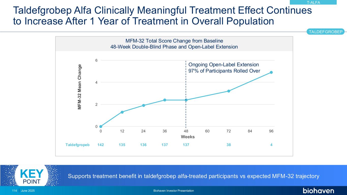 taldefgrobep Alfa临床意义治疗效果在总体人群MFM-32治疗1年后继续增加总分从基线48周双盲阶段和开放标签延长的总分变化024601224364860728496 m F M-3 2 m e a n c h a n g e weeks taldefgropeb 142137413513613738支持taldefgrobep Alfa治疗的参与者与预期的MFM-32轨迹的治疗获益关键点2025年6月Biohaven投资者介绍114正在进行的开放标签延长97%的参与者翻滚了TALDEFGROBEP T-ALFA