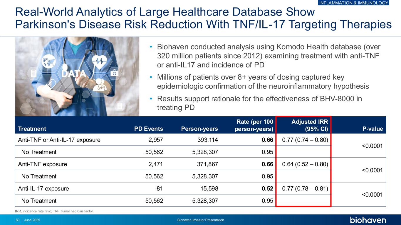 大型医疗保健数据库的真实世界分析显示,TNF/IL-17靶向疗法可降低帕金森病风险• Biohaven使用Komodo Health数据库(自2012年以来超过3.2亿患者)进行分析,检查抗TNF或抗IL17的治疗PD和发病率•超过8 +年给药的数百万患者获得了神经炎症假说的关键流行病学证实•结果支持BHV-8000治疗PD治疗有效性的基本原理PD事件人年率(每100人年)调整后IRR(95% CI)P值抗TNF或抗IL-17暴露2,957393,1140.66 0.77(0.74 – 0.80)< 0.0001未治疗50,5625,328,3070.95抗TNF暴露2,471371,8670.66 0.64(0.52 – 0.80)< 0.0001未治疗50,5625,328,3070.95抗IL-17暴露8115,5980.52 0.77(0.78 – 0.81)< 0.0001未治疗50,5625,328,3070.95 IRR,发生率比;TNF,肿瘤坏死因子。炎症与免疫学2025年6月Biohaven投资者说明会80