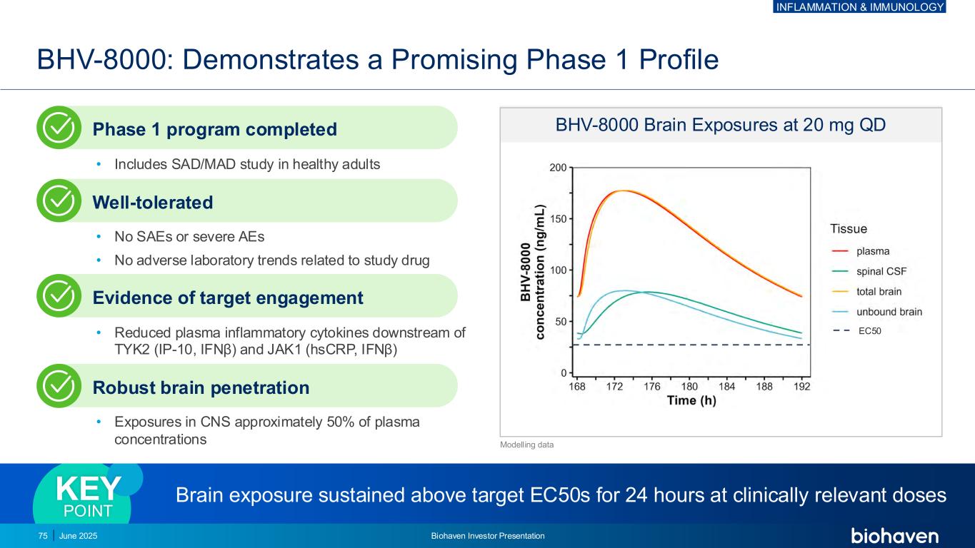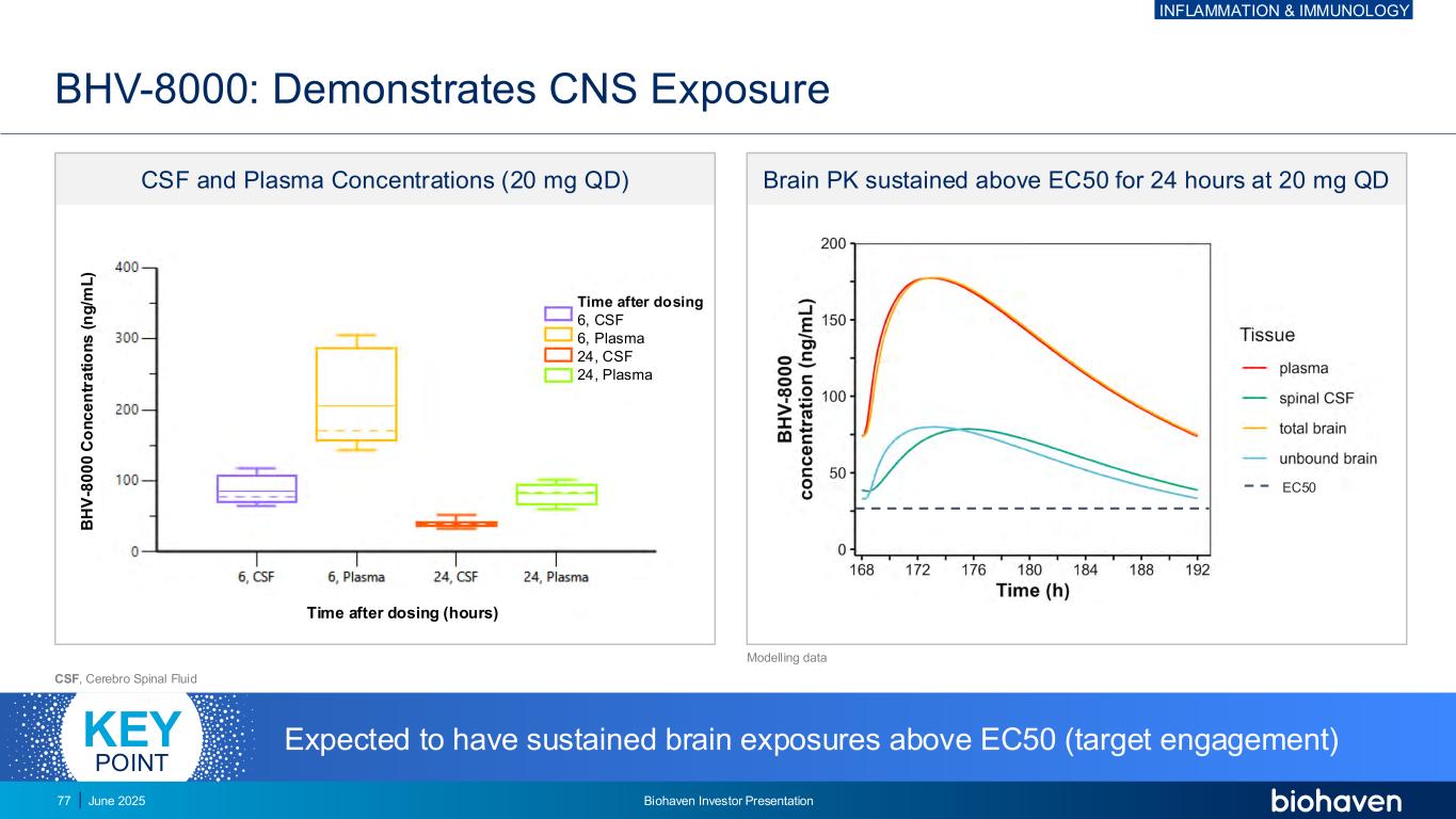 给药6、CSF 6、血浆24、CSF 24、血浆BHV-8000后时间:显示CNS暴露CSF、脑脊液预期持续脑暴露高于EC50(靶点接合)关键点CSF和血浆浓度(20mg QD)脑PK在20mg丨QDB HV-8 000 C o n c e n tr a ti o n s(n g/m l)给药后时间(小时)EC50建模数据炎症和免疫学2025年6月Biohaven投资者宣讲会77