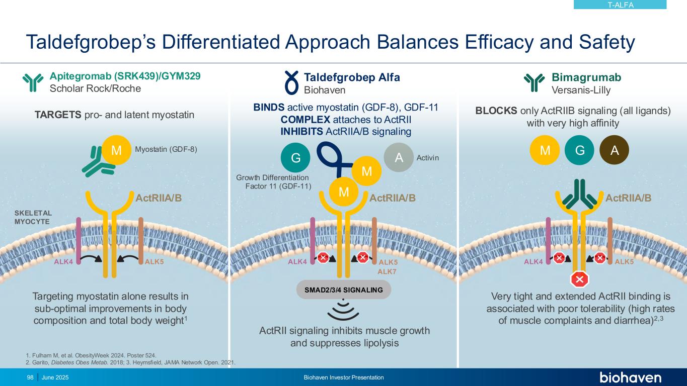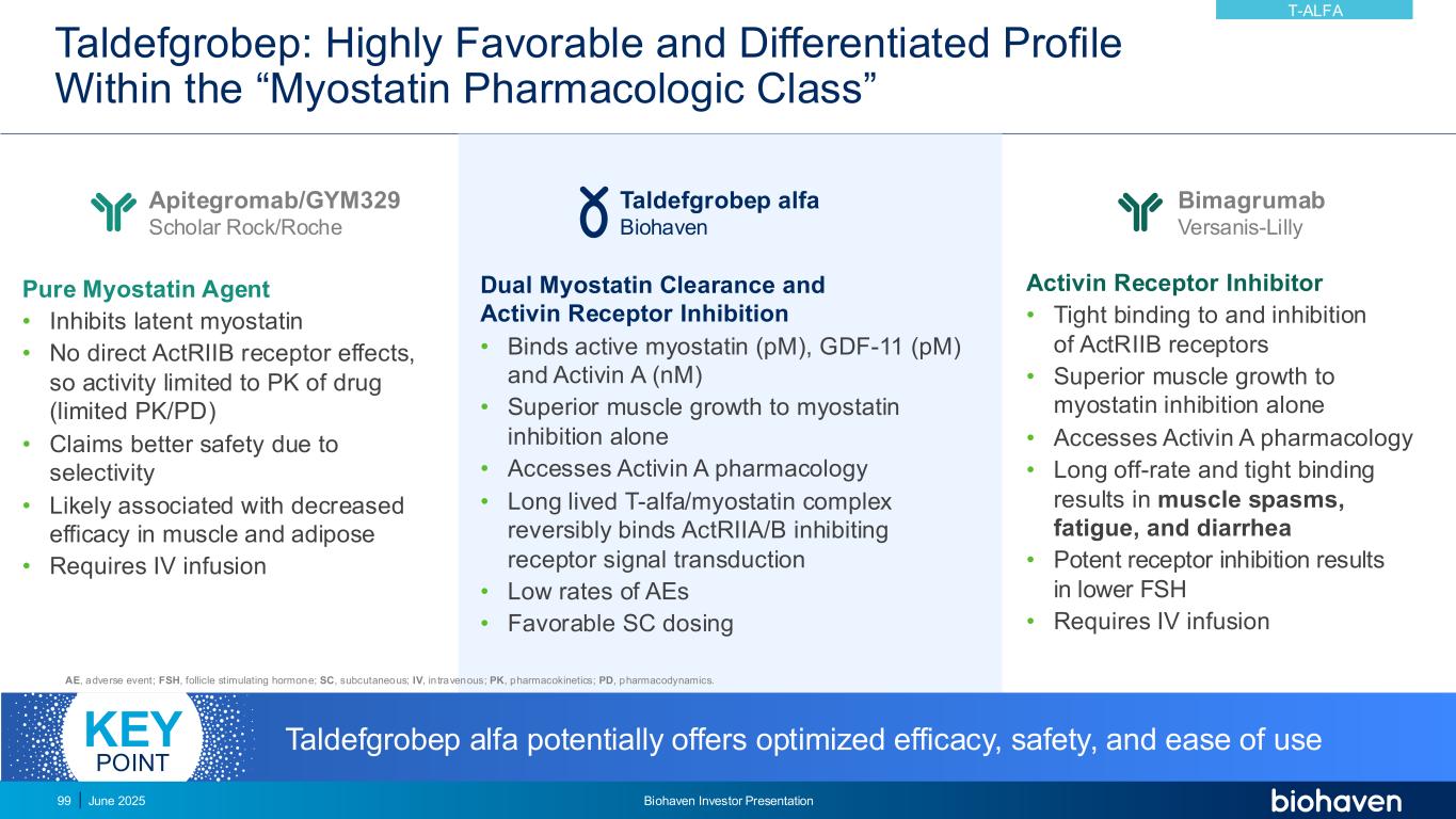 TaldefGrobep的差异化方法平衡了疗效和安全性2025年6月Biohaven投资者说明会98 ALK4 ALK5 ActRIIA/B SKELETAL MYOCYTESMAD2/3/4 SIGNALING ActRII信号传导抑制肌肉生长并抑制脂肪分解ALK4 ALK5 ActRIIA/B ALK4 ALK5 ActRIIA/B M M G A M M靶点前体和潜伏肌生长抑制素Apitegromab(SRK439)/GYM329 Scholar Rock/Roche TaldefGrobep Alfa丨Biohaven丨BINDS活性肌肉抑制素(GDF-8),GDF-11 COMPLEX附着于ActRII抑制ActRIIA/B信号Bimagrumab Versanis-Lilly仅阻断具有非常高亲和力的ActRIIB信号(所有配体)单独靶向肌肉抑制素的G ALK7导致身体成分和总体重的次优改善1非常紧密和延长的ActRII结合与耐受性差(肌肉主诉和腹泻的高发率)相关2,31。Fulham M,et al. ObesityWeek 2024。海报524。2.Garito,糖尿病obes metab。2018; 3.Heymsfield,JAMA网络开放。2021.肌肉抑制素(GDF-8)生长分化因子11(GDF-11)激活素T-ALFA