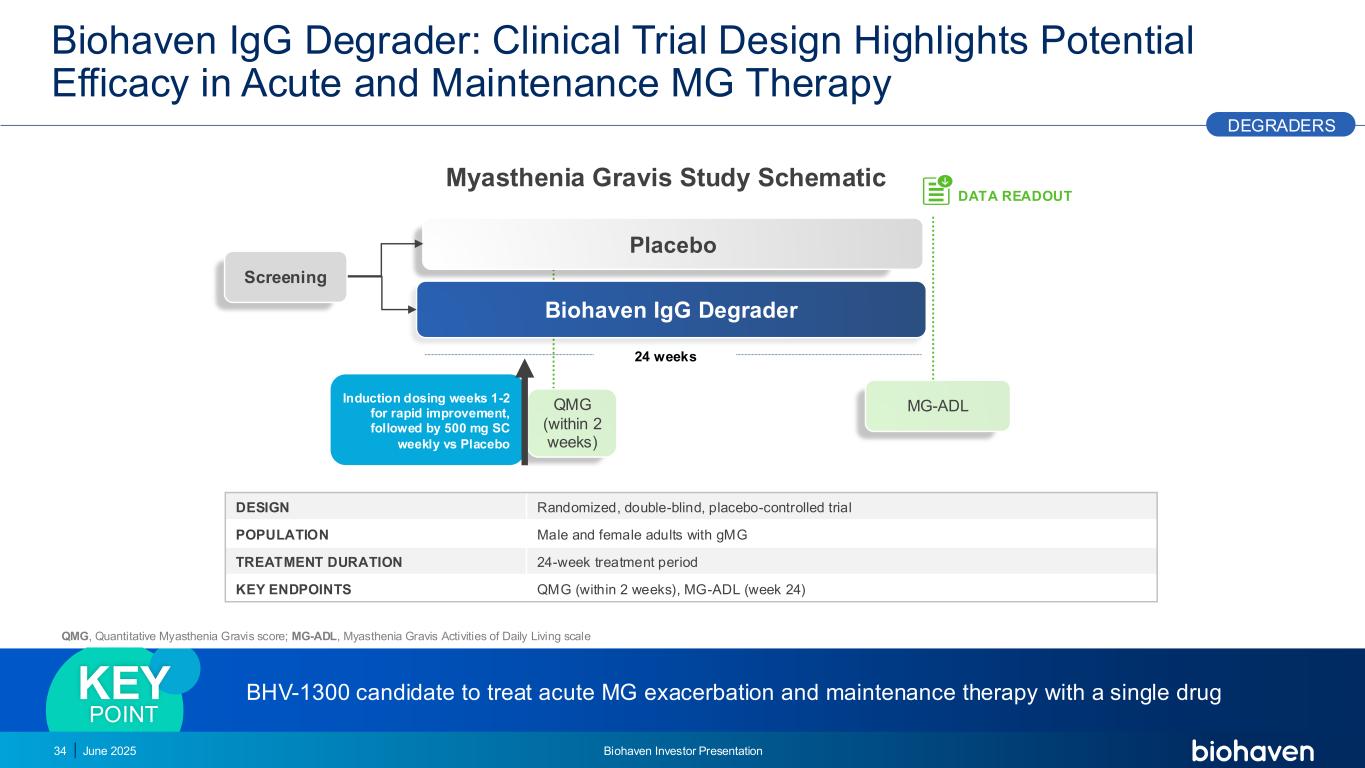 Biohaven IGG降解剂:临床试验设计突出在急性和维持性MG治疗QMG(2周内)中的潜在疗效设计随机、双盲、安慰剂对照试验人群男性和女性成人GMG治疗持续时间24周治疗期关键终点QMG(2周内)、MG-ADL(第24周)BHV-1300候选者治疗急性MG加重和维持性治疗单药关键点24周数据读取丨Biohaven 丨Biohaven IGG降解剂安慰剂筛选MG-ADL诱导给药第1-2周快速改善,随后每周500mg SC vs安慰剂降解剂2025年6月34定量重症肌无力评分;MG-ADL、日常生活量表之重症肌无力活动