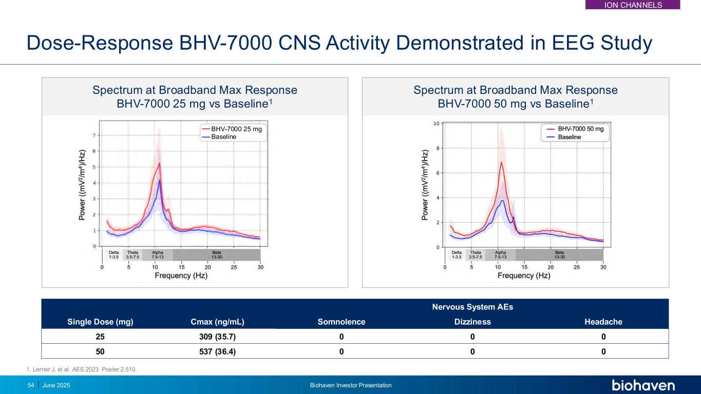 宽带最大响应时的频谱BHV-7000 50 mg vs Baseline1宽带最大响应时的频谱BHV-7000 25 mg vs Baseline1剂量响应BHV-7000 CNS活性在脑电图研究中得到证明单剂量(mg)Cmax(ng/mL)神经系统AEs嗜睡头晕头痛25309(35.7)00050537(36.4)000 BHV-7000 25 mg基线2025年6月54日Biohaven投资者介绍1。Lerner J,et al. AES 2023。海报2.510。ION渠道