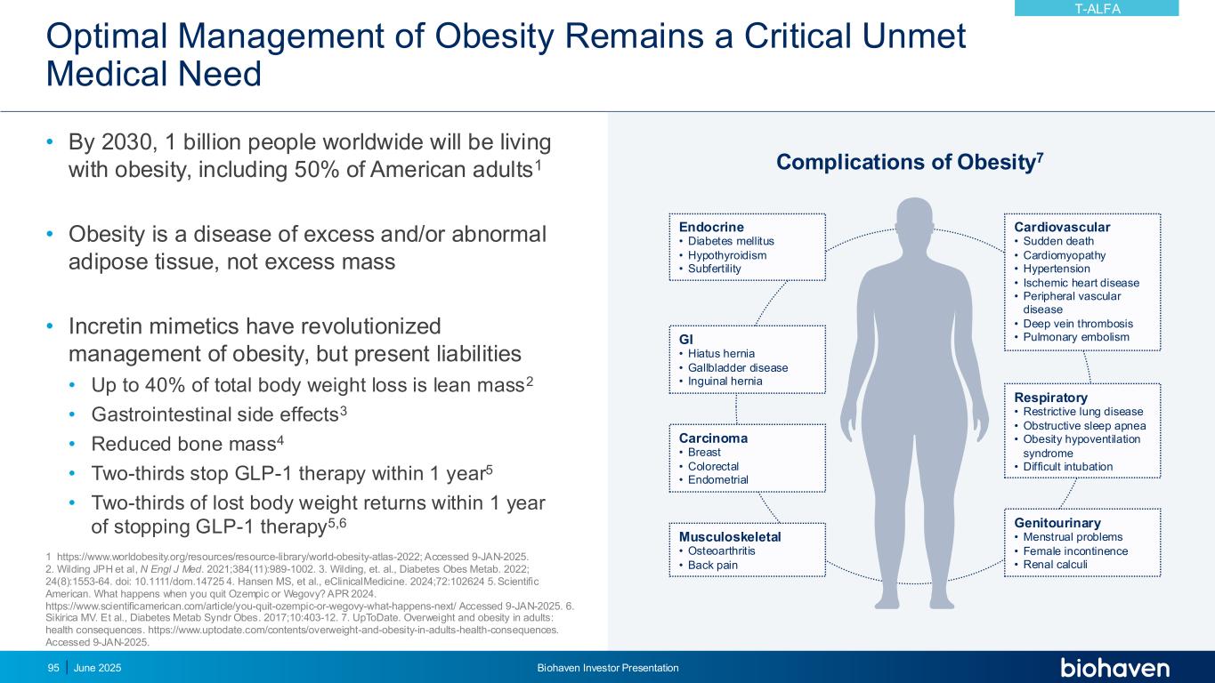 肥胖的优化管理仍然是一项关键的未满足的医疗需求•到2030年,全球将有10亿人生活在肥胖中,其中包括50%的美国成年人1 •肥胖是一种脂肪组织过剩和/或异常的疾病,而不是质量过剩•消炎素模拟物已经彻底改变了肥胖的管理,但目前的负债•高达40%的总体重减轻是瘦体重2 •胃肠道副作用3 •骨量减少4 •三分之二在1年内停止GLP-1治疗5 •三分之二的体重减轻在停止GLP-1治疗1年内恢复5,6内分泌•糖尿病•甲状腺功能减退• GI不全•裂孔疝•胆囊病•腹股沟疝癌•乳腺•结直肠•子宫内膜肌肉骨骼•骨关节炎•背痛心血管•猝死•心肌病•高血压•缺血性心脏病•外周血管疾病•深静脉血栓形成•肺栓塞呼吸道•限制性肺病•阻塞性睡眠呼吸暂停•肥胖低通气综合征•插管困难泌尿生殖系统•月经问题•女性大小便失禁•肥胖的肾结石并发症7 1 https://www.worldobesity.org/resources/resource-library/world-obesity-atlas-2022;访问日期2025年1月9日。2.Wilding JPH et al,N Engl J Med. 2021;384(11):989-1002。3.Wilding等,糖尿病obes metab。2022;24(8):1553-64。doi:10.1111/dom.14725 4。Hansen MS,et al.,eClinicalMedicine。2024;72:102624 5.科学美国人。当你退出Ozempic或Wegovy时会发生什么?2024年4月。https://www.scientificamerican.com/article/you-quit-ozempic-or-wegovy-what-happens-next/访问时间为2025年1月9日。6.Sikirica MV。等,糖尿病Metab Syndr Obes。2017;10:403-12.7.UpToDate。成年人超重和肥胖:健康后果。https://www.uptodate.com/contents/overweight-and-obesity-in-adults-health-consequences。于2025年1月9日访问。T-ALFA 2025年6月Biohaven投资者说明会95