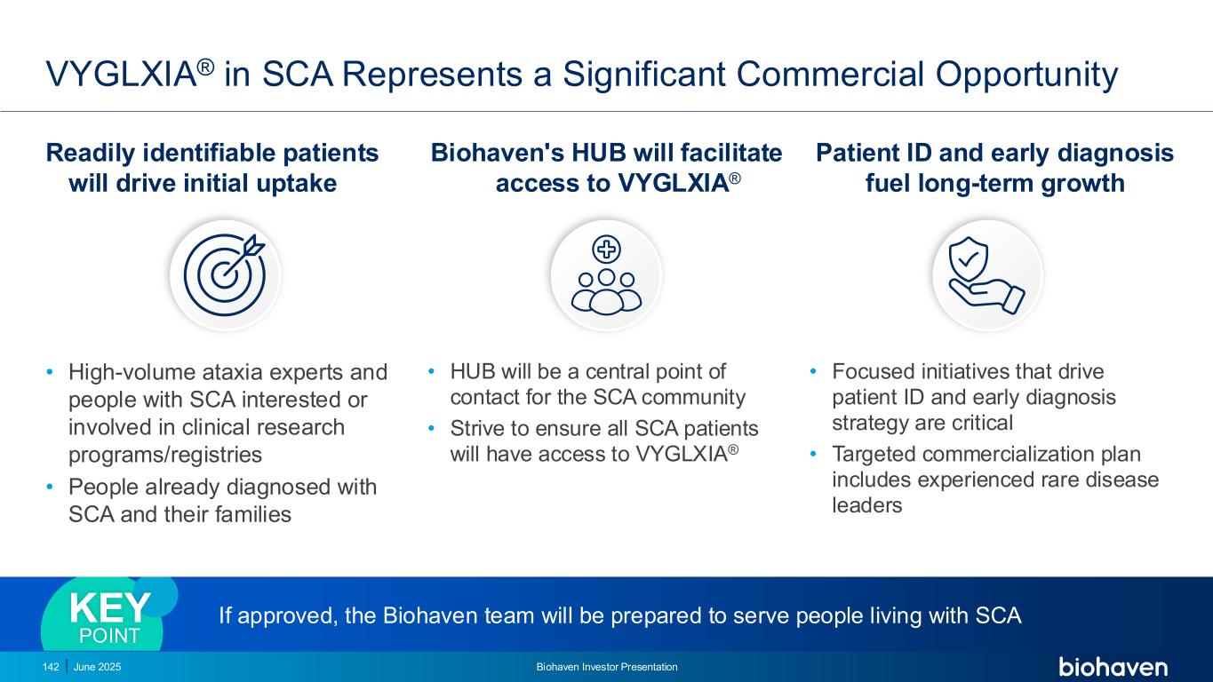 VYGLXIA®在SCA代表了一个重要的商业机会• HUB将成为SCA社区的中心接触点•努力确保所有SCA患者都能获得VYGLXIA®•有兴趣或参与临床研究计划/登记的大量共济失调专家和SCA患者•已经被诊断为SCA的人及其家人Biohaven的HUB将为获得VYGLXIA提供便利®易于识别的患者将推动初步吸收•有重点的举措推动患者ID和早期诊断战略至关重要•有针对性的商业化计划包括经验丰富的罕见病领导者患者ID和早期诊断为长期增长提供动力如果获得批准,Biohaven团队将准备好服务于SCAKEY POINT患者2025年6月142日Biohaven投资者说明会