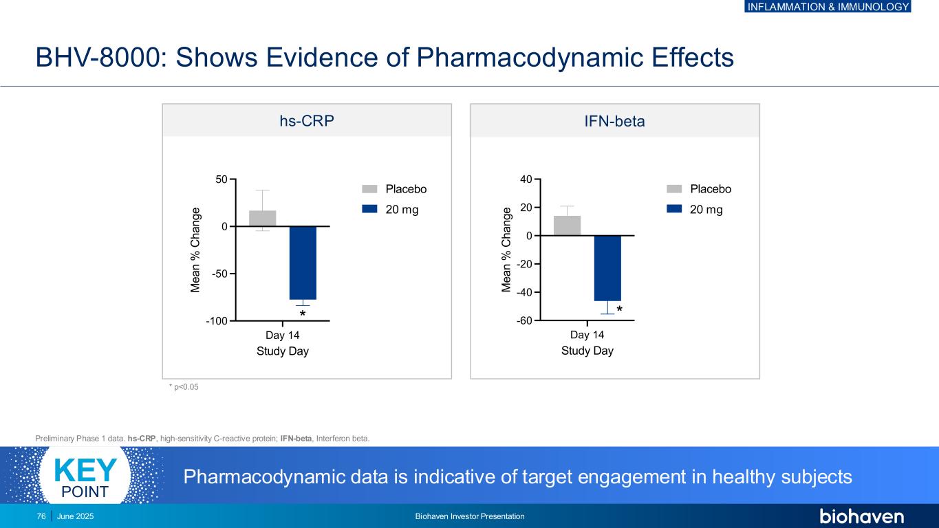 BHV-8000:在临床相关剂量关键点BHV-8000脑暴露20 mg QD EC50建模数据1期项目完成•包括在耐受性良好的健康成人中进行的SAD/MAD研究•没有SAE或严重AES •没有与靶点参与的研究药物证据相关的不良实验室趋势• TYK2(IP-10,IFN β)和JAK1(hsCRP,IFN β)下游的血浆炎性细胞因子降低,大脑渗透强劲•在CNS中的暴露约为血浆浓度的50% 2025年6月75丨BioHAVE丨投资者介绍炎症和免疫学