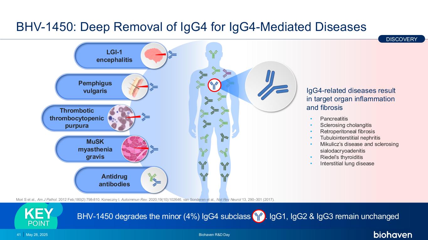 BHV-1450:IGG4深度去除治疗IGG4介导的疾病2025年5月28日Biohaven研发Day41 IGG4相关疾病导致靶器官炎症和纤维化•胰腺炎•硬化性胆管炎•腹膜后纤维化•管间质性肾炎• Mikulicz病和硬化性唾液泪腺炎• Riedel甲状腺炎•间质性肺病BHV-1450降解较小(4%)的IGG4亚类。IGG1、IGG2 & IGG3保持不变关键点血栓性血小板减少性紫癜LGI-1脑炎寻常型天疱疮musk重症肌无力抗药物抗体发现Mori S等,am J Pathol。2012年2月;180(2):798-810。Koneczny I. Autoimmun Rev. 2020;19(10):102646. van Sonderen et al.,Nat Rev Neurol 13,290 – 301(2017)。