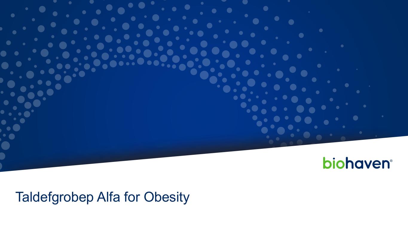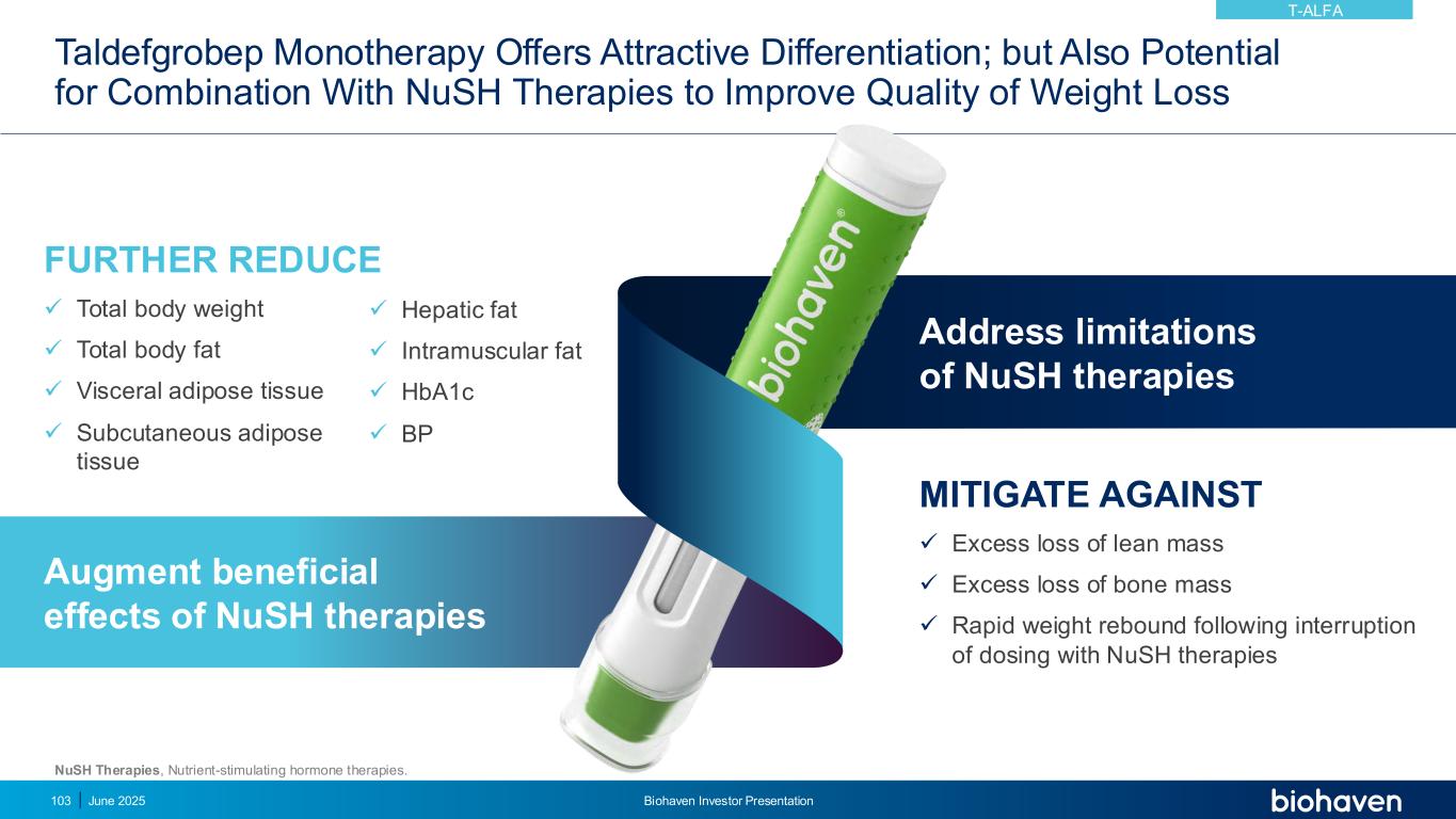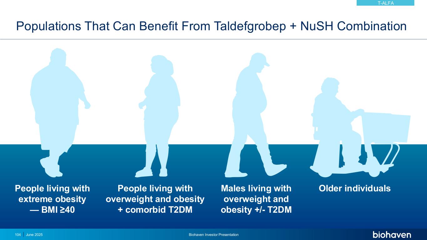 可从taldefgrobep + nuSH组合中受益的人群2025年6月Biohaven投资者介绍104名超重和肥胖人群+合并T2DM男性超重和肥胖人群+/-T2DM老年人极端肥胖人群— BMI ≥ 40 T-ALFA