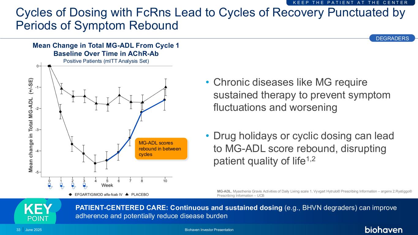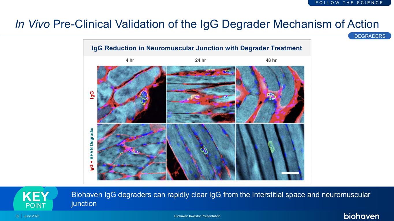 IGG降解剂作用机制的体内临床前验证Biohaven IGG降解剂可快速清除间质空间和神经肌肉接头的IGG关键点IG IG G + B H V N D e g ra d e r神经肌肉接头的IGG还原与降解剂治疗4 hr 24 hr 48 hr降解剂F O L L O W T H E S C I E N C E 2025年6月丨Biohaven投资者介绍32