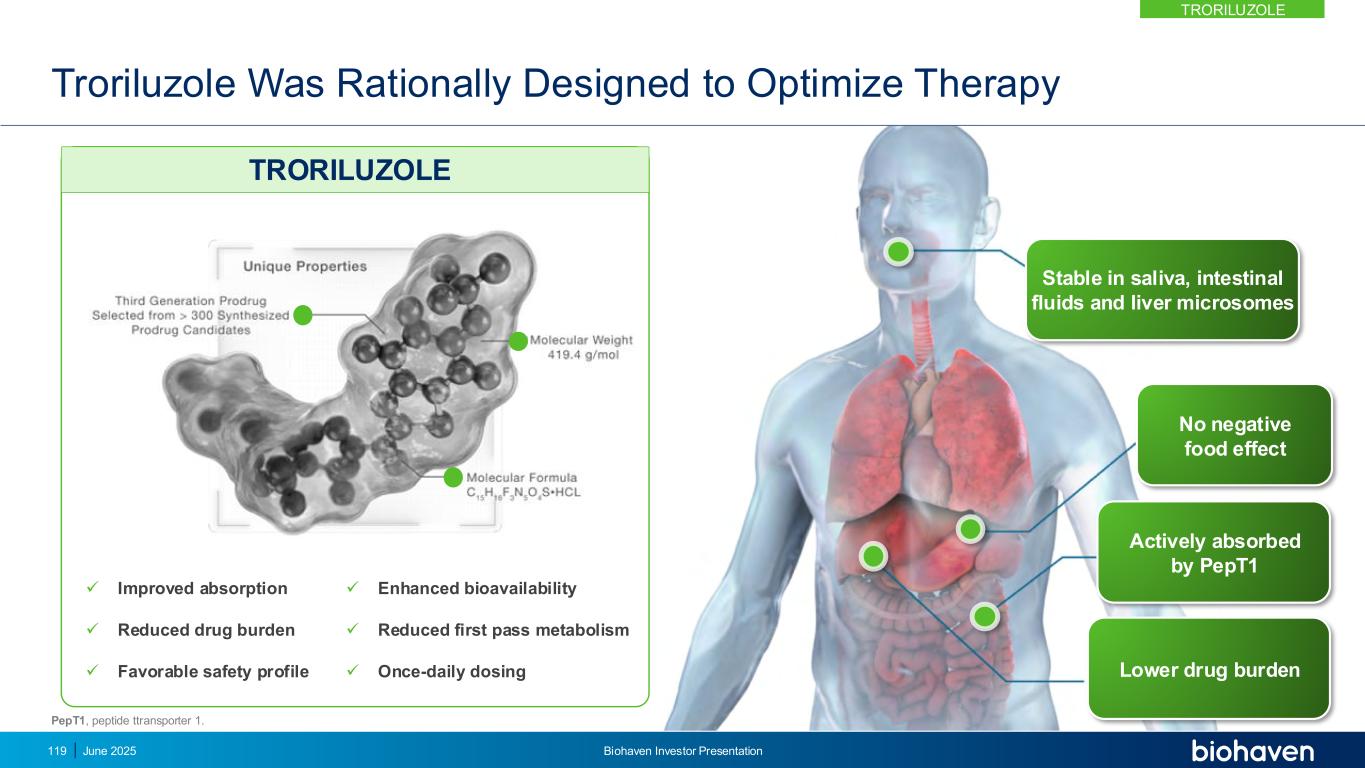 Troriluzole被合理设计以优化治疗丨改善吸收丨增强生物利用度丨降低药物负担丨降低首过代谢丨有利的安全性丨日一次给药在唾液、肠液和肝微粒体中稳定无负面食物效应被PepT1主动吸收降低药物负担PepT1,肽ttransporter 1。特罗鲁唑2025年6月119日Biohaven投资者说明会特罗鲁唑