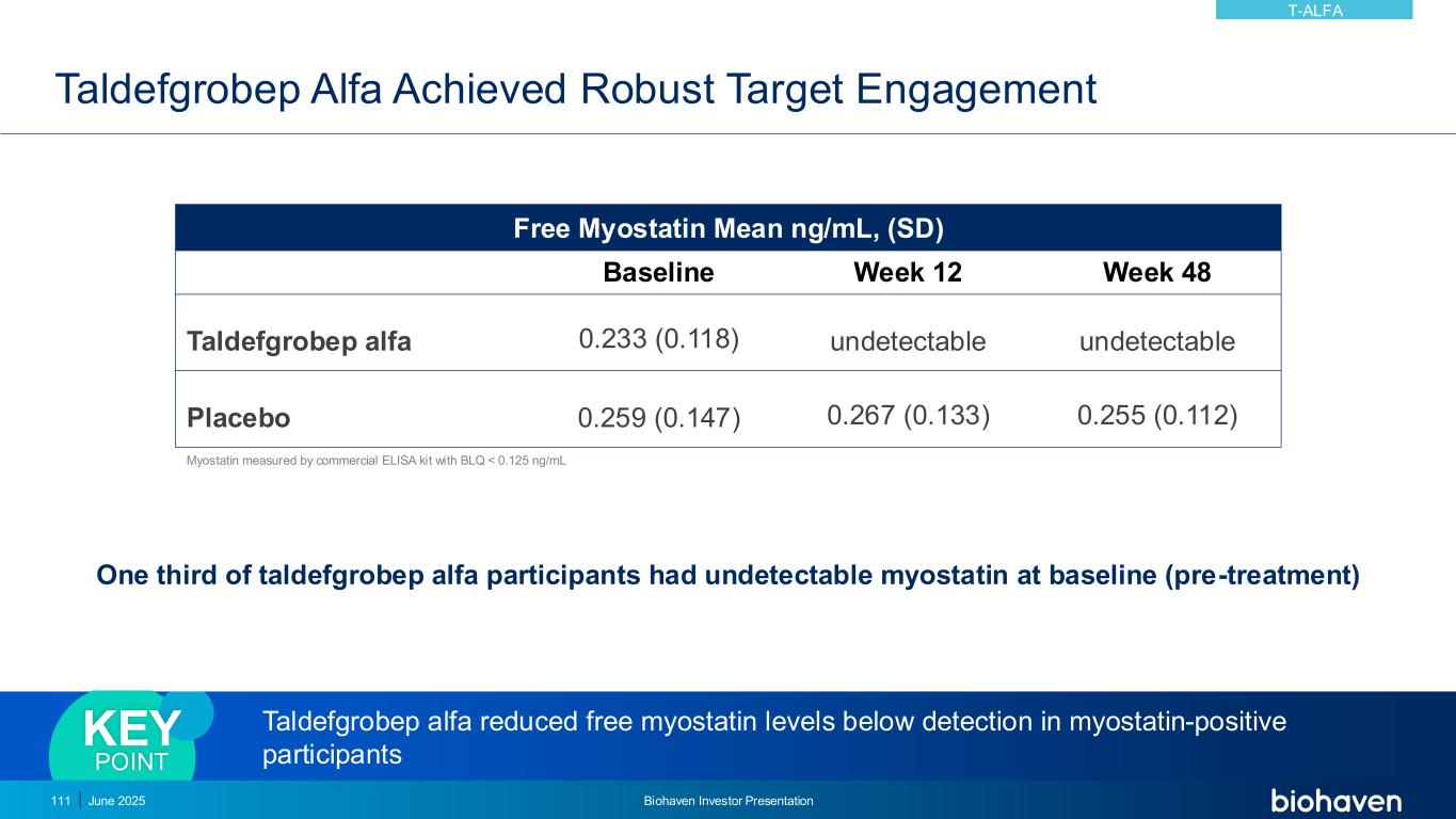 Taldefgrobep Alfa实现了稳健的目标参与三分之一的taldefgrobep alfa参与者在基线(治疗前)游离肌肉抑制素平均ng/ml时有无法检测到的肌肉抑制素,(SD)基线第12周第48周taldefgrobep alfa 0.233(0.118)无法检测到的无法检测到的安慰剂0.259(0.147)0.267(0.133)0.255(0.112)用商业ELISA试剂盒测量的肌肉抑制素,BLQ < 0.125ng/mL taldefgrobep alfa在myostatin阳性参与者中将游离肌肉抑制素水平降低到低于检测值关键点2025年6月Biohaven投资者宣讲111 T-ALFA