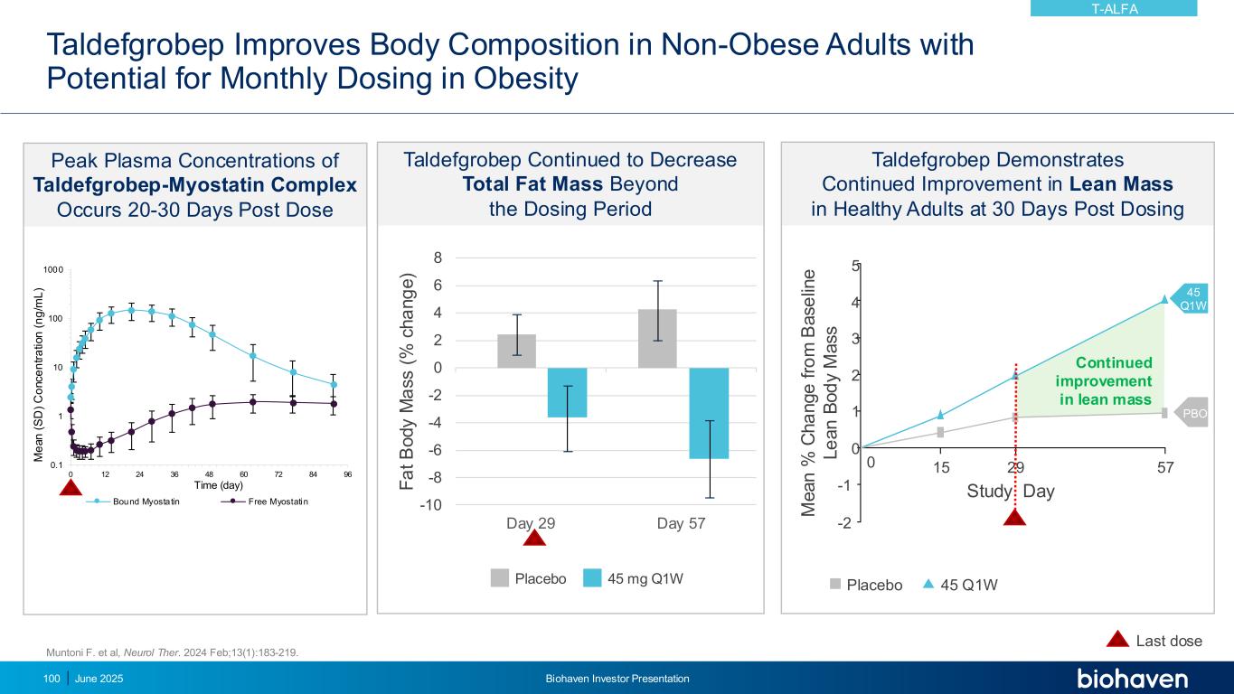 TaldefGrobep:在“Myostatin药理类”纯肌生长抑素药物中具有高度有利和差异化的特征•抑制潜在的肌生长抑素•没有直接的ActRIIB受体效应,因此活性仅限于药物的PK(有限的PK/PD)•声称由于选择性而具有更好的安全性•可能与肌肉和脂肪的功效下降有关•需要静脉输注Activin受体抑制剂•与ActRIIB受体紧密结合和抑制•仅对myostatin抑制具有卓越的肌肉生长•获得Activin A药理•超长的脱速和紧密结合导致肌肉痉挛、疲劳,和腹泻•有效受体抑制导致较低的FSH •需要静脉输注双重肌肉抑制素清除和激活素受体抑制•结合活性肌肉抑制素(pM)、GDF-11(pM)和激活素A(nM)•肌肉生长优于单独的肌肉抑制素抑制•获得激活素A药理学•长寿命T-alfa/myostatin复合体可逆地结合ActRIIA/B抑制受体信号转导•低AEs率•有利的SC给药Apitegromab/GYM329 Scholar Rock/Roche Taldefgrobep alfa Biohaven Bimagrumab Versanis-Lilly AEE,不良事件;FSH,促卵泡激素;SC,皮下;TaldefGrobep Alfa潜在地提供优化的功效、安全性和易用性关键点T-ALFA 2025年6月Biohaven投资者说明会99