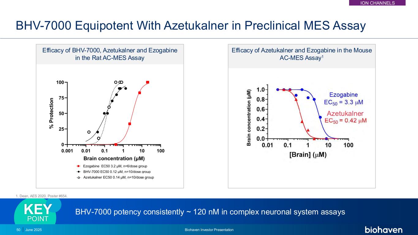 BHV-7000在复杂神经元系统测定中的效力一致~120nM关键点BHV-7000与Azetukalner在大鼠AC-MES测定中BHV-7000、Azetukalner和Ezogabine的临床前MES测定的效力0.00 10.01 0.11 101000255075100最大电击模型(大鼠)脑浓度(μ m)% P ro te c ti o n BHV-7000 EC50 0.12 μ m,n = 10/剂量组XEN1101 EC50 0.14 μ m,n = 10/剂量组Ezogabine EC50 3.2 μ m,n = 6/剂量组0.00 10.01 0.11 101000255075100最大电击模型(大鼠)脑浓度(μ M)% P ro te c ti o n BHV-7000 EC50 0.12,n = 10/剂量组XEN1101 EC50 0.14 μ m,n = 10/剂量组Ezogabine EC50 3.2 μ m,n = 6/剂量组Azetukalner和Ezogabine在小鼠AC-MES测定中的疗效1。院长,AES 2020。海报# 654。Azetukalner EC50 0.14 μ m,n = 10/剂量组Azetukalner 50 b ra in c o n c e n tr a ti o n(μ m)2025年6月Biohaven投资者介绍ION Channels