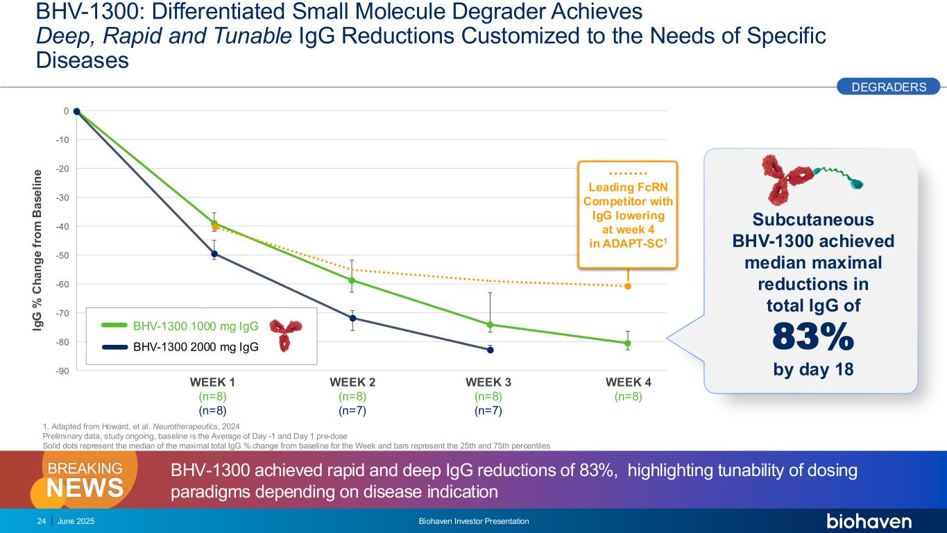 -90-80-70-60-50-40-30-20-10 0 BHV-1300:差异化小分子降解器实现深,根据特定疾病的需求定制快速和可调节的IGG降低2025年6月24日Biohaven投资者介绍IG G % C h a n g e f ro m B a s e li n e week 1(n = 8)(n = 8)WeEK2(n = 8)(n = 7)WeEK3(n = 8)(n = 7)WeEK4(n = 8)BHV-1300 1000mg IGG BHV-1300 2000mg IGG皮下注射BHV-1300在第18天实现了83%的总IGG中位最大降低BHV-1300实现了83%的快速和深度IGG降低,突出了剂量范式的可调性取决于疾病适应症NEWS BREAKING 1。改编自Howard,et al. Neurotherapeutics,2024初步数据,研究正在进行中,基线是第1天和第1天给药前的平均值实心点代表当周相对于基线的最大总IGG %变化的中位数,条形代表在ADAPT-SC1降级器中第4周IGG降低的第25和第75个百分位的领先FCRN竞争对手