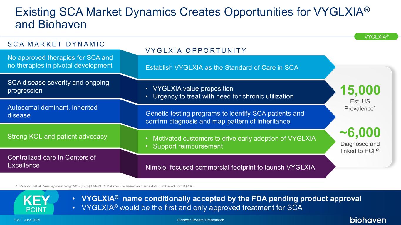 现有SCA市场动态为VYGLXIA创造机会®和Biohaven • VYGLXIA®FDA有条件接受的名称待产品批准• VYGLXIA®将是第一个也是唯一一个被批准的SCA治疗关键点没有批准的SCA疗法,也没有治疗关键发展SCA疾病严重程度和持续进展的常染色体显性,遗传性疾病强大的KOL和患者倡导卓越中心的集中护理将VYGLXIA确立为SCA的护理标准• VYGLXIA价值主张•迫切需要治疗慢性利用基因检测计划以识别SCA患者并确认诊断和遗传图谱模式•激励客户推动早期采用VYGLXIA •支持报销灵活,专注商业足迹推出VYGLXIA S C A M A R K E T D Y N A M I C V Y G L X I A O P P O R T U N I T Y VYGLXIA®~6,000诊断并连接HCP2 15,000 EST。美国流行率11。Ruano L,et al.神经流行病学。2014;42(3):174-83.2.Data on File based on claims data purchased from 艾昆纬。138年2025年6月Biohaven投资者说明会