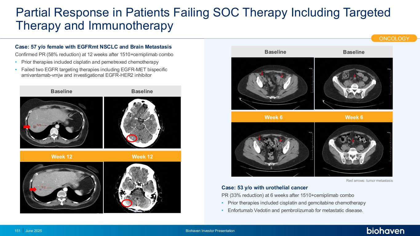 未通过SOC治疗(包括靶向治疗和免疫治疗)的患者出现部分反应2025年6月Biohaven投资者介绍151红色箭头:肿瘤转移第6周基线第6周基线病例:1510 + cemiplimab组合后6周53 y/o伴尿路上皮癌PR(降低33%)•先前的治疗包括顺铂和吉西他滨化疗• Enfortumab Vedotin和pembrolizumab用于转移性疾病。肿瘤学病例:57y/o女性EGFRMT NSCLC和脑转移在1510 + cemiplimab组合后12周确认PR(减少58%)•先前的治疗包括顺铂和培美曲塞化疗•包括EGFR-MET双特异性amivantamab-vmjw和研究性EGFR-HER2抑制剂的两种EGFR靶向治疗失败第12周基线第12周基线