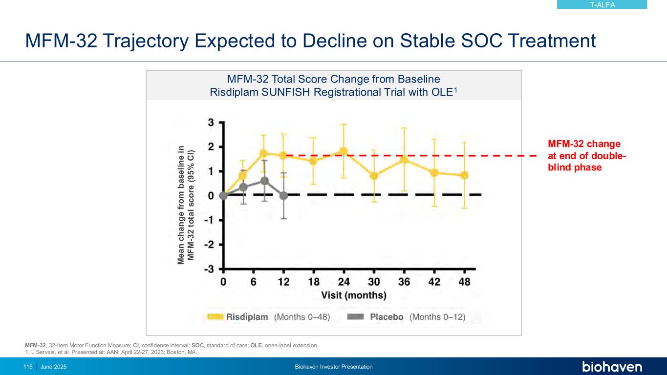 MFM-32轨迹预期在稳定SOC治疗上下降MFM-32总分变化从基线Risdiplam SUNFISH注册试验与OLE1 MFM-32变化在双盲阶段M e a n c h a n g e f ro m b a s e li n e i n m f m-3 2 t o ta l s c o re(95% c i)MFM-32,32项运动功能测量;CI,置信区间;SOC,护理标准;OLE,开放标签扩展。1.L Servais,et al. Presented at:AAN;2023年4月22日-27日;马萨诸塞州波士顿。2025年6月Biohaven投资者说明会115 T-ALFA
