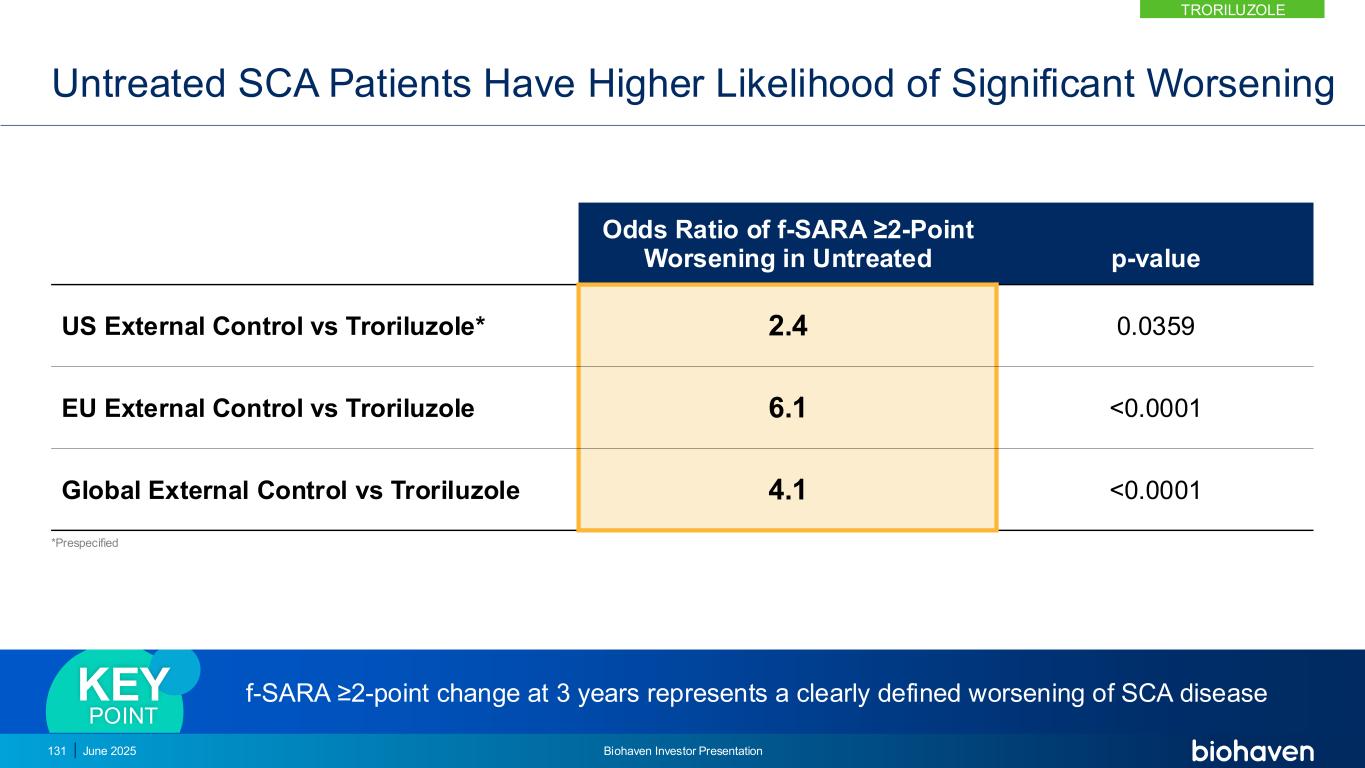 未经治疗的SCA患者出现明显恶化的可能性更高*未经治疗的p值美国外控vs曲鲁唑f-SARA ≥ 2点恶化的预指定赔率比*2.4 0.0359欧盟外控vs曲鲁唑6.1 < 0.0001全球外控vs曲鲁唑4.1 < 0.0001 3年时f-SARA ≥ 2点变化代表明确定义的SCA疾病恶化关键点2025年6月131日Biohaven投资者介绍TroriluZOLE