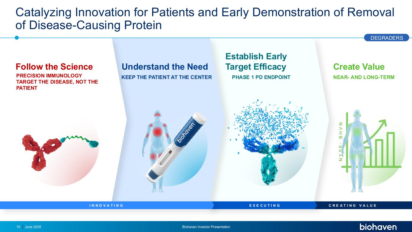 A转化MODER药物平台:细胞外蛋白(MODER)分子降解剂精准平衡组分选择最佳疗效、安全性、产品概况目标BINDER稳定链接器ASGPR BINDER化合物LIBRARY BINDER化合物LIBRARY MODER平台IND,研究性新药申请。Accelerate IND timelines(12 – 18mo)Efficiently Remove Immune targets causing disease fast starting and potential for > 90% deeply reduction of target selective targeting of proteins avoids immunization hibitation Ability to adjustment dosage fc biologics Biohaven的MODE平台正在快速生成用于多种疾病关键点降级器的候选药物2025年6月Biohaven投资者介绍9
