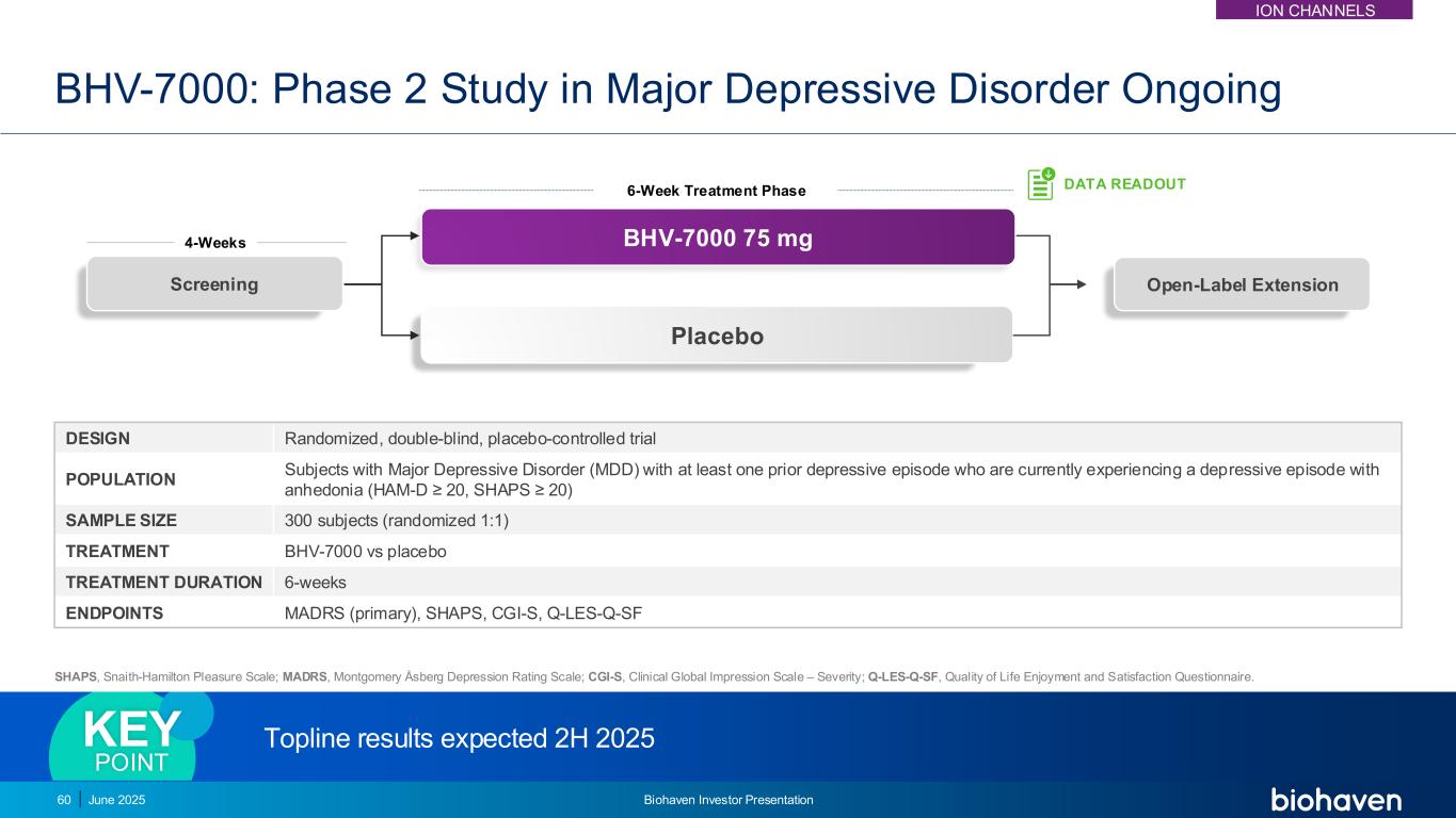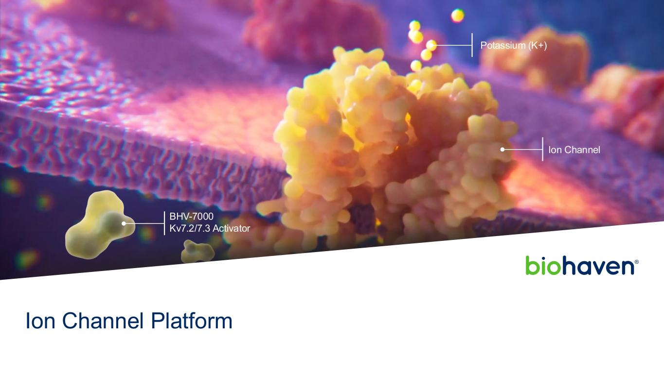 BHV-7000:重度抑郁症持续设计随机、双盲、安慰剂对照试验的2期研究患有重度抑郁症(MDD)且至少有一次既往抑郁发作且目前正在经历抑郁发作伴快感缺失(HAM-D ≥ 20,SHAPS ≥ 20)的人群样本大小300名受试者(随机1:1)治疗BHV-7000 vs安慰剂治疗持续时间6周终点MADRS(主要)、SHAPS、CGI-S、Q-LES-Q-SF SHAPS、Snaith-Hamilton快乐量表;MADRS、Montgomery Ausberg抑郁评定量表;CGI-S,临床整体印象量表–数据读出筛查安慰剂6周治疗4周期BHV-7000 75mg开放标签延长顶线结果预计2025年2月关键点2025年6月30日Biohaven投资者介绍ION Channels