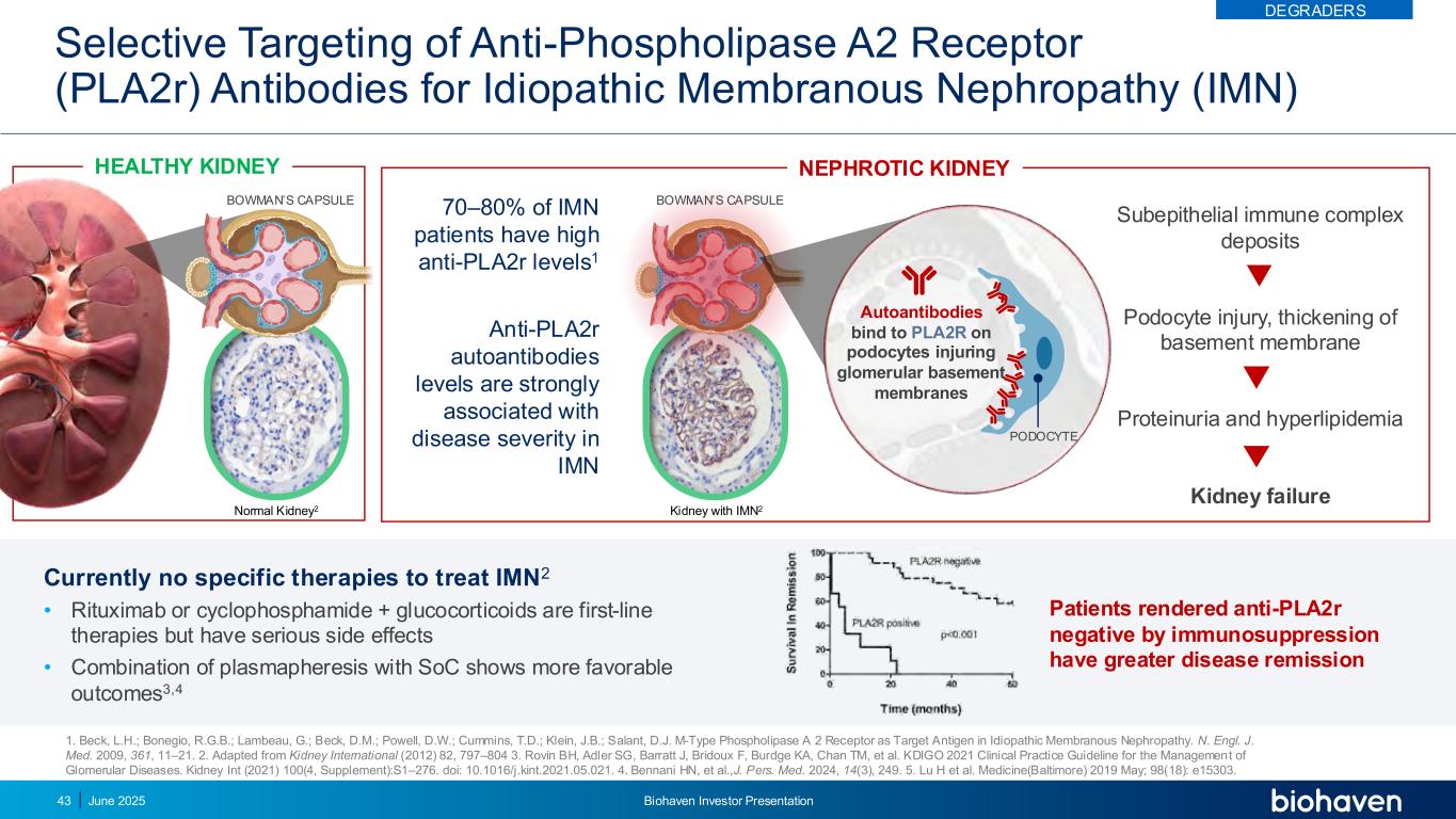 选择性靶向抗磷脂酶A2受体(PLA2r)抗体治疗特发性膜性肾病(IMN)健康肾脏目前没有治疗IMN2的特异性疗法•利妥昔单抗或环磷酰胺+糖皮质激素是一线疗法,但副作用严重•血浆置换术与SoC联合显示更有利的结果3,4因免疫抑制而使抗PLA2r阴性的患者有更大的疾病缓解1。Beck,L.H.;Bonegio,R.G.B.;Lambeau,G.;Beck,D.M.;Powell,D.W.;康明斯,T.D.;Klein,J.B.;Salant,D.J. M型磷脂酶A2受体作为特发性膜性肾病的靶抗原。N. Engl。J. Med. 2009,361,11 – 21。2.改编自肾脏国际(2012)82,797 – 8043。Rovin BH,Adler SG,Barratt J,Bridoux F,Burdge KA,Chan TM,et al. KDIGO2021年肾小球疾病管理临床实践指南。Kidney Int(2021)100(4,Supplement):S1 – 276。doi:10.10 16/j.kint.2021.05.021。4.Bennani HN,et al.,J. Pers。Med. 2024,14(3),249。5.Lu H et al. Medicine(Baltimore)2019 May;98(18):e15303。BOWMAN CAPSULE70 – 80% IMN患者抗PLA2r水平高1抗PLA2r自身抗体水平与IMN肾脏疾病严重程度强相关IMN2自身抗体结合PLA2R对足细胞损伤肾小球基底膜PODOCYTE上皮下免疫复合物沉积足细胞损伤、基底膜蛋白尿增厚和高脂血症肾功能衰竭NPHROTIC KIDNEY BOWMAN的CAPSUL正常肾2降级器2025年6月Biohaven投资者介绍43