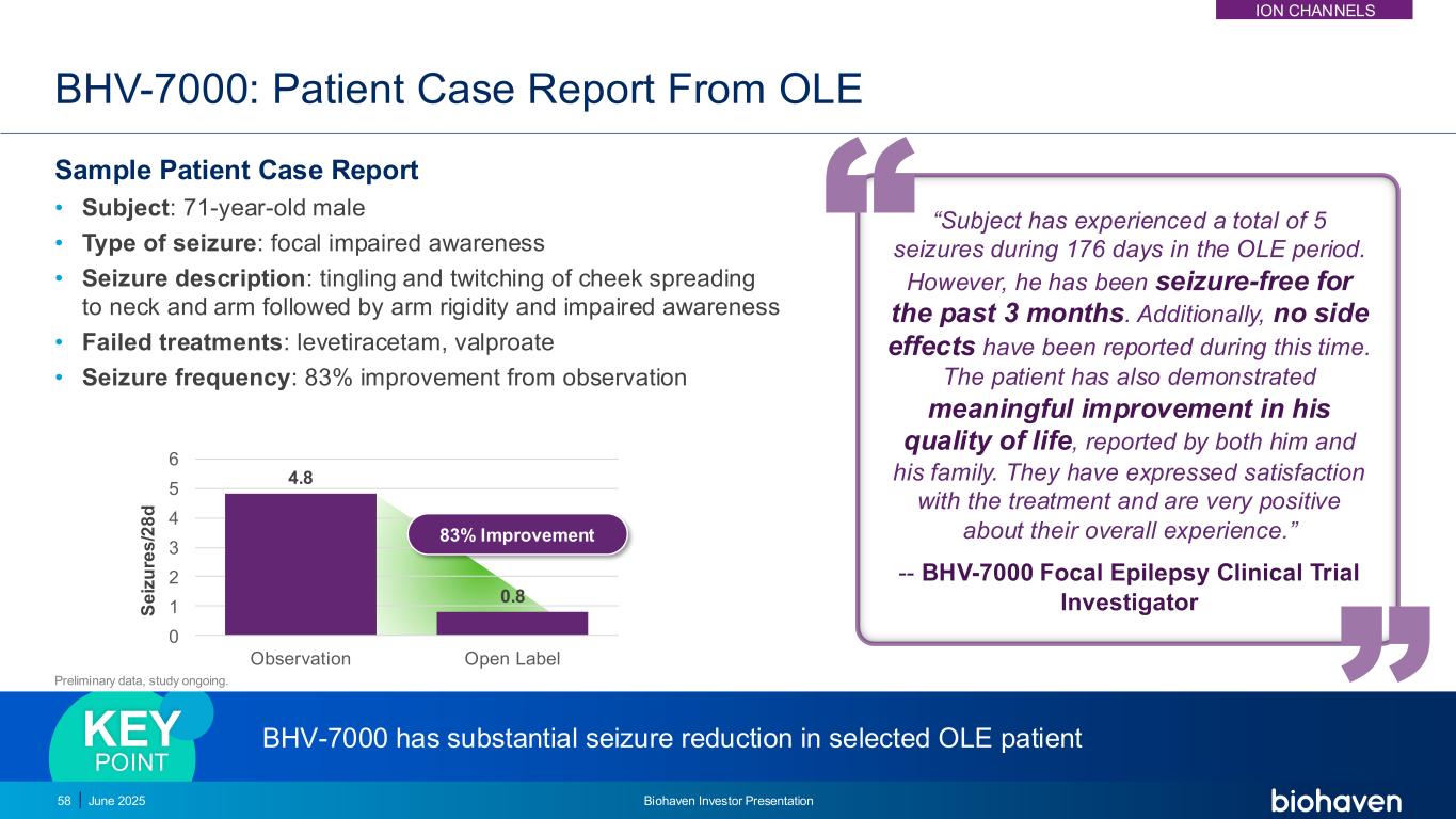 4.8 0.80 123456观察开放标签BHV-7000:来自OLE样本患者病例报告的患者病例报告•受试者:71岁男性•癫痫发作类型:局灶性意识障碍•癫痫发作描述:面颊刺痛和抽搐蔓延至颈部和手臂,随后手臂僵硬和意识障碍•治疗失败:左乙拉西坦、丙戊酸•癫痫发作频率:比观察改善83%“受试者在OLE期间的176天内总共经历了5次癫痫发作。不过,他过去3个月一直没有癫痫发作。此外,在此期间没有报告任何副作用。据他和他的家人报告,这名患者的生活质量也得到了显着改善。他们对治疗表示满意,并对他们的整体经历非常积极。”--BHV-7000局灶性癫痫临床试验研究者BHV-7000在选定的OLE患者中具有显着的癫痫发作减少KEY POINT S E IZ U re s/28 d83 %的改善2025年6月8日Biohaven投资者介绍初步数据,研究正在进行中。ION渠道