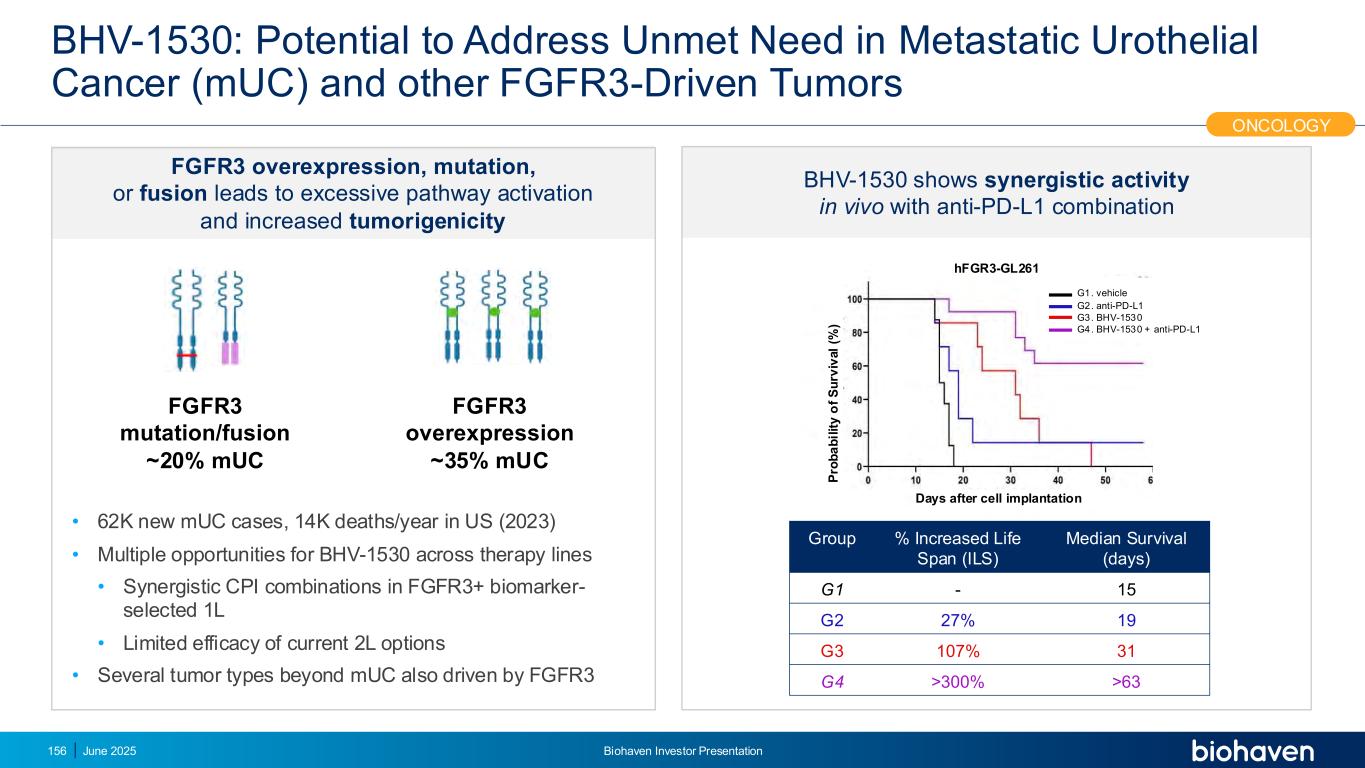 BHV-1530:有可能解决转移性尿路上皮癌(mUC)和其他FGFR3驱动的肿瘤中未满足的需求2025年6月Biohaven投资者介绍156 P ro b a b il it y o f s u rv iv iv a l(%)细胞植入后的天数BHV-1530在体内显示出与抗PD-L1组合G1的协同活性。载体G2。抗PD-L1 G3。BHV-1530 G4。BHV-1530 +抗PD-L1 hFGR3-GL261组%增加的寿命(ILS)中位生存期(天)G1-15 G2 27% 19 G3 107% 31 G4 > 300% > 63 •美国新增6.2万例mUC病例,每年死亡1.4万例(2023)• BHV-1530跨治疗线的多种机会• FGFR3 +生物标志物选择的1L中具有协同性的CPI组合•当前2L选项的疗效有限• mUC以外的几种肿瘤类型也由FGFR3突变/融合~20% mUC FGFR3过表达~35% mUC FGFR3过表达、突变或融合导致过度的通路激活和致瘤性增加肿瘤学