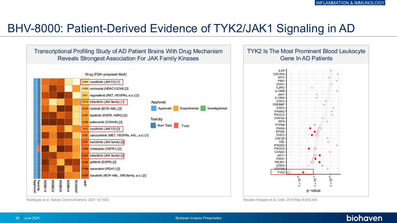 具有药物机制的AD患者大脑的转录分析研究揭示了JAK家族激酶BHV-8000的最强关联:AD TYK2/JAK1信号传导的患者来源证据TYK2是AD患者g e n e Nevado-Holgado等细胞中最突出的血液白细胞基因。2019年5月8日;8(5):425 Rodriguez等人,Nature Communications。202112:1033毒性炎症与免疫学2025年6月Biohaven投资者说明会88