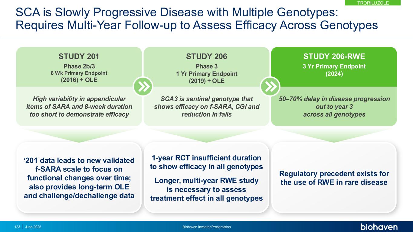 ‘201数据导致新的经过验证的f-SARA量表关注随时间的功能变化;还提供长期OLE和挑战/去挑战数据1年RCT持续时间不足,无法在所有基因型中显示疗效更长,多年RWE研究对评估所有基因型的治疗效果是必要的监管先例已有RWE用于罕见病STUDY 201 2b/38 WK主要终点(2016)+ OLE STUDY 206 3期1年主要终点(2019)+ OLE STUDY 206-RWE 3年主要终点(2024)SARA附录项目的高变异性和8周持续时间太短无法证明疗效SCA3是对f-SARA显示疗效的前哨基因型,CGI和跌倒减少50 – 70%延迟所有基因型的疾病进展到第3年SCA是具有多种基因型的缓慢进展疾病:需要多年随访以评估跨基因型的疗效1232025年6月Biohaven投资者介绍TroriluZOLE