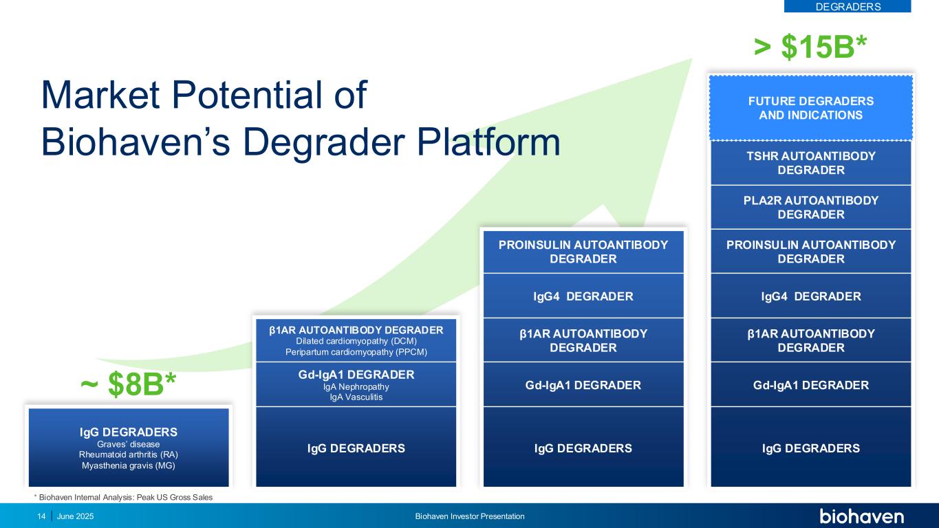 1H 2025 BHV-1300 Graves病2025研究2026顶线数据BHV-1310重症肌无力研究BHV-1600心肌病研究新模式和TRAP降解剂进入1期IGG4降解剂、PLA2R自身抗体降解剂、TSHR自身抗体降解剂2H 2025 – 2026 BHV-1400 IgA肾病研究BHV-1300 1期BHV-1400 1期BHV-1600 1期2025模式和TRAP平台验证催化2026年关键治疗适应症的关键发展2025年6月Biohaven投资者介绍13