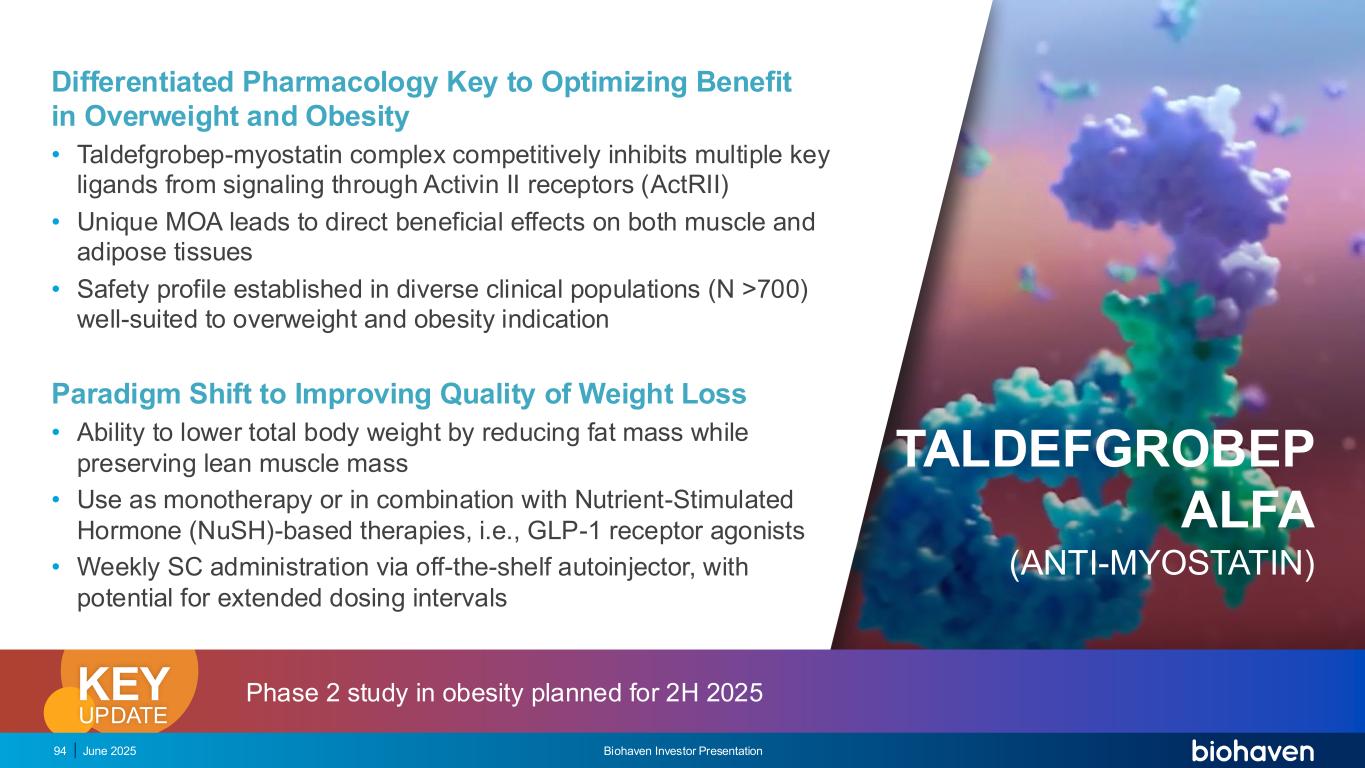 2025年6月Biohaven投资者介绍94差异化药理学优化超重和肥胖获益的关键• taldefGrobep-肌生长抑素复合体通过Activin II受体(ActRII)竞争性抑制多个关键配体的信号传导•独特的MOA导致对肌肉和脂肪组织的直接有益影响•在非常适合超重和肥胖适应症的不同临床人群(N > 700)中建立的安全性范式转向提高减肥质量• Ability通过减少脂肪量来降低总体重,同时保持瘦肌肉质量•用作单一疗法或与基于营养刺激激素(NUSH)的疗法联合使用,即,GLP-1受体激动剂•通过现成的自动注射器每周给药SC,具有延长给药间隔的潜力TALDEFGROBEP ALFA(抗肌氧抑制素)2期研究在肥胖症中的应用计划于2H 2025KEY更新
