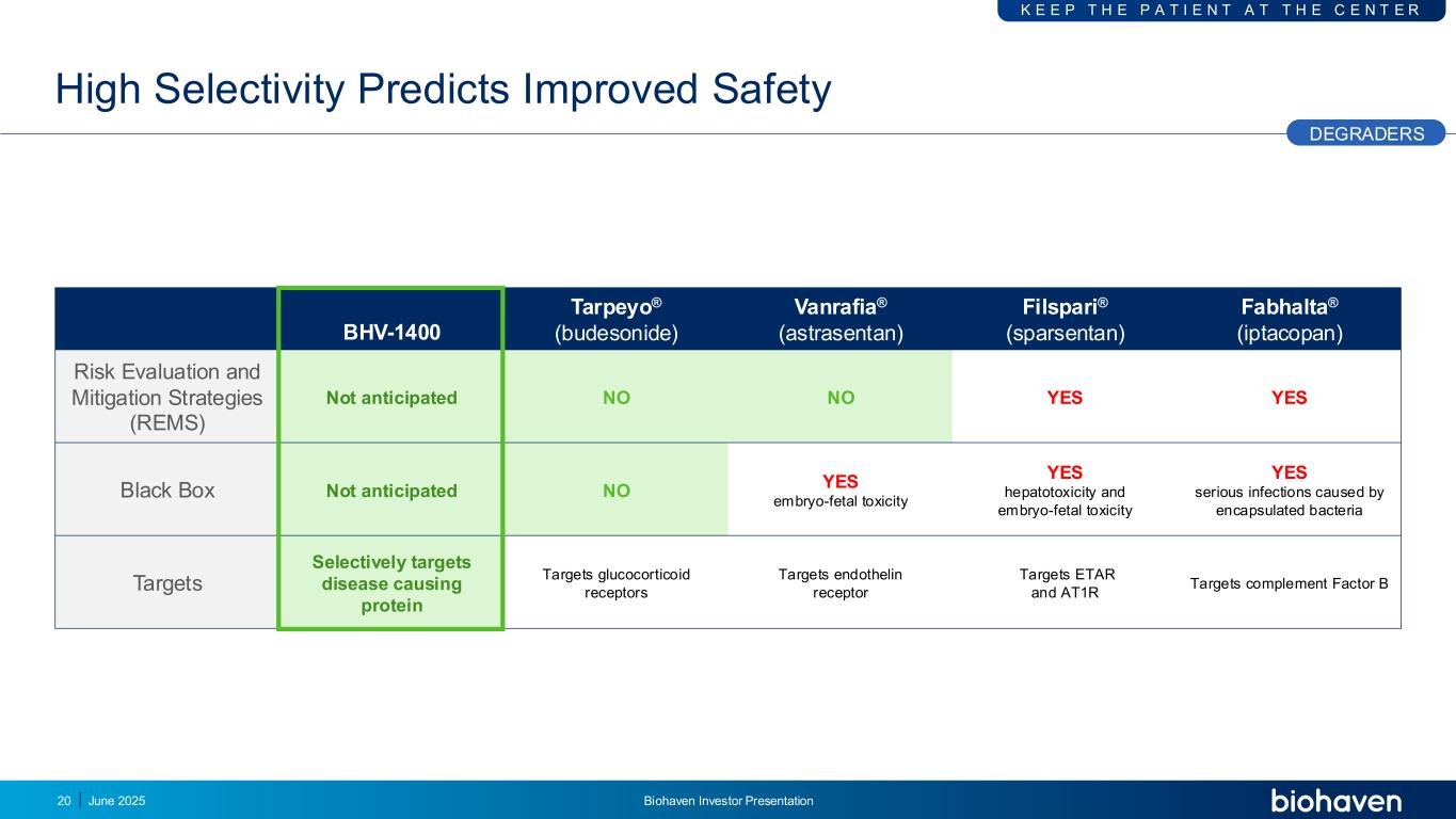 高选择性预测改进的安全降级器BHV-1400 Tarpeyo®(布地奈德)万拉菲亚®(astrasentan)Filspari®(sparsentan)Fabhalta®(iptacopan)风险评估和缓解策略(REMS)未预期NO NO NO YES YES 黑盒未预期NO YES胚胎-胎儿毒性YES肝毒性和胚胎-胎儿毒性YES包膜细菌靶点引起的严重感染选择性靶向致病蛋白靶点糖皮质激素受体靶点内皮素受体靶点ETAR和AT1R靶点补体因子B20 K E P T H E P A T I E N T A T T H E C E N T E R 2025年6月丨Biohaven投资者说明会