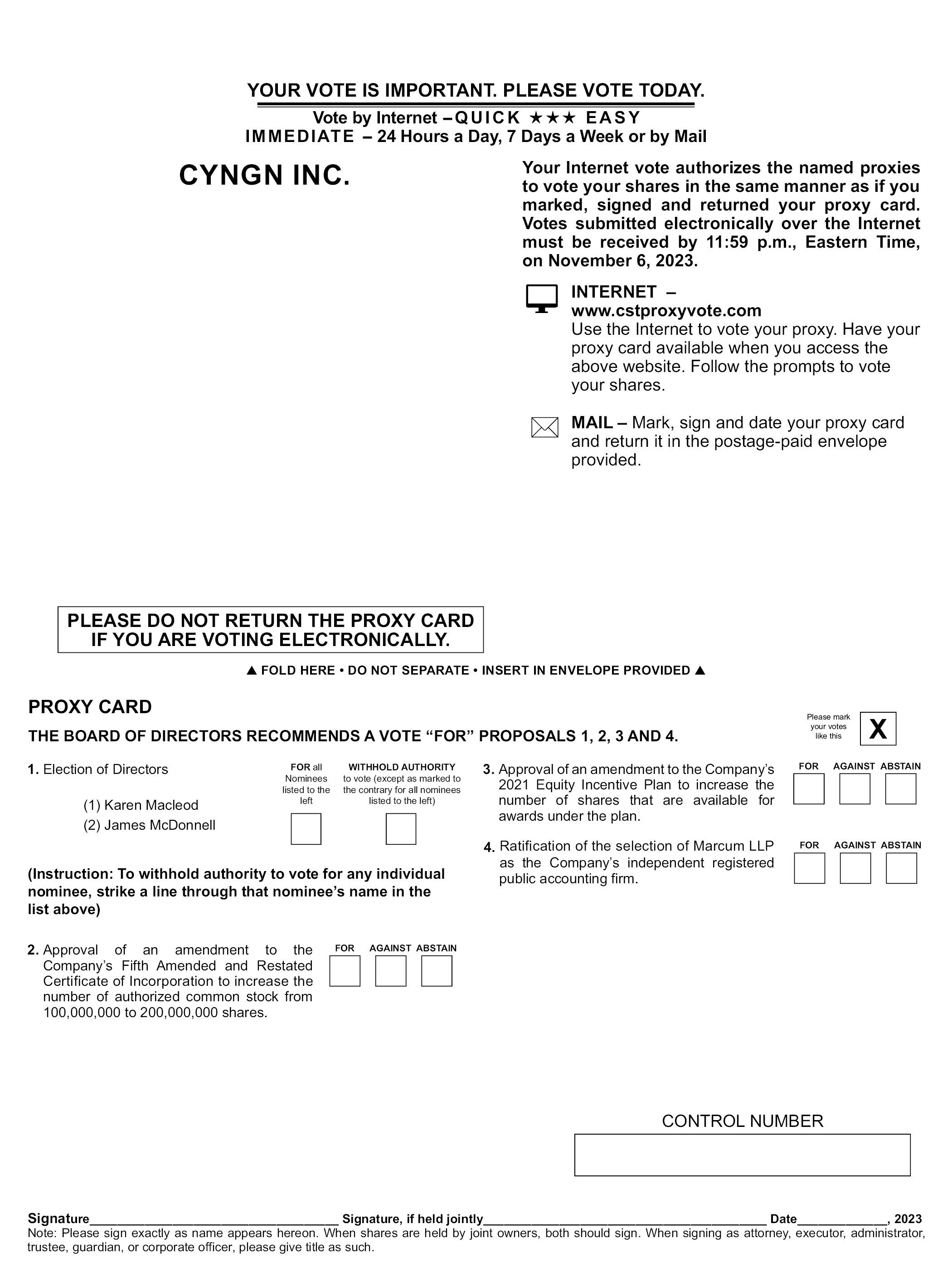 你的投票很重要。请今天投票。通过互联网快速轻松立即投票一周7天每天24小时或通过邮件CYNGN INC。您的互联网投票授权指定的代理人投票您的股份,就像您标记,签名和返回您的代理卡一样。通过互联网以电子方式提交的投票必须在美国东部时间2023年11月6日晚上11:59之前收到。INTERNET www.cstproxyvote.com使用互联网对您的代理人进行投票。当您访问上述网站时,请准备好您的代理卡。按照提示对你的股票进行投票。邮寄标记,签名和日期您的代理卡和返回它在邮资已付的信封提供。请不要退回代理卡,如果你是电子投票。代理卡在这里不单独插入信封提供请标记董事会建议一个投票“赞成”提案1,2,3和4。您的投票像这样1。选举董事(1)Karen Macleod(2)James McDonnell支持所有列在左边的被提名人,但保留投票权(除非所有列在左边的被提名人被标记为相反)3。批准对公司2021年股权激励计划的修订,以增加根据该计划可用于奖励的股票数量。批准选定Marcum LLP为公司独立注册会计师事务所(说明:若要保留投票给任何个人被提名人的权力,请在上述名单中该被提名人的名字中间划一行)。批准对公司第五次修订和重述的公司注册证书的修订,将授权普通股的数量从100,000,000股增加到200,000,000股。反对弃权控制号码签名,如果共同持有日期,2023年注:请完全按照此处显示的姓名签名。当股份由共同所有人持有时,双方应签字。在作为律师、遗嘱执行人、管理人、受托人、监护人或公司管理人员签字时,请提供相应的所有权。