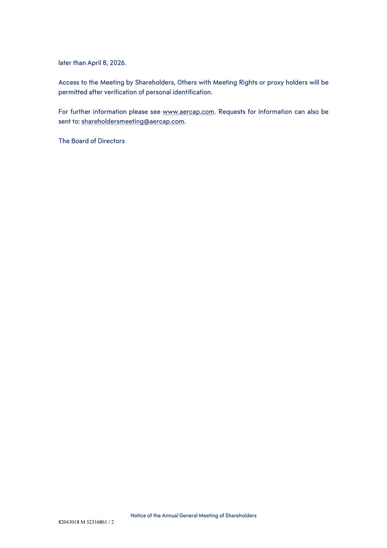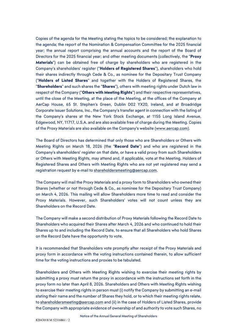 说明拟审议议题的会议议程副本;对议程的解释;提名与薪酬委员会关于2025财政年度的报告;包含年度账目的年度报告和2025财政年度的董事会报告;以及其他会议文件(统称“代理材料”)可由登记在公司股东名册的股东(“登记股份持有人”)、通过Cede & Co.间接持有其股份的股东免费索取,作为存托信托公司(“上市股份持有人”,连同登记股份持有人、“股东”和此类股份的“股份”)的代名人,根据荷兰法律对公司拥有会议权利的其他人(“拥有会议权利的其他人”)及其各自的代表,在会议结束前,在会议地点,在公司位于AerCap House,65 St. Stephen’s Green,Dublin D02 YX20,Ireland的办公室,以及在Broadridge Corporate Issuer Solutions,Inc.,与公司股票在纽约证券交易所上市有关的公司转让代理,地址为1155 Long Island Avenue,Edgewood,NY,11717,U.S.A.,也可在会议期间免费获得。代理材料的副本也可在公司网站(www.aercap.com)上查阅。董事会已厘定,只有于2026年3月18日(「记录日期」)为股东或其他拥有会议权利的人士,并于该日期登记在公司股东名册内,或拥有该等股东或其他拥有会议权利的人士的有效代理人,方可出席会议并(如适用)于会上投票。登记在册的股份持有人和尚未登记的其他具有会见权的持有人,可通过电子邮件方式将登记请求发送至shareholdersmeeting@aercap.com。公司将于2026年3月4日将代理材料和代理表格邮寄给拥有其股份的股东(无论是否通过Cede & Co.,作为存托信托公司的代名人)。这封邮件将让股东有更多时间阅读和考虑代理材料。然而,该等股东的投票将不会被计算在内,除非他们是记录日期的股东。公司将于记录日期后向于2026年3月4日后取得其股份并于记录日期(包括当日)继续持有其股份的股东进行第二次代理材料分派,以确保于记录日期持有股份的所有股东均有机会投票。建议股东在收到代理材料和代理表格后,按照其中所载的投票指示及时进行投票,为投票指示和代理制表留出充足时间。股东及其他有会议权利的人士如欲透过提交代表委任而行使其会议权利,须不迟于2026年4月8日按照代表委任表格所载的指示交回代表委任。希望亲自行使其会议权利的股东和其他拥有会议权利的人必须(i)通过向shareholdersmeeting@aercap.com提交一封电子邮件通知公司,说明他们的姓名和所持有的股份数量,或与他们的会议权利相关的股份数量;以及(ii)就上市股份持有人而言,向公司提供有关该等股份的所有权和投票权的适当证据,不