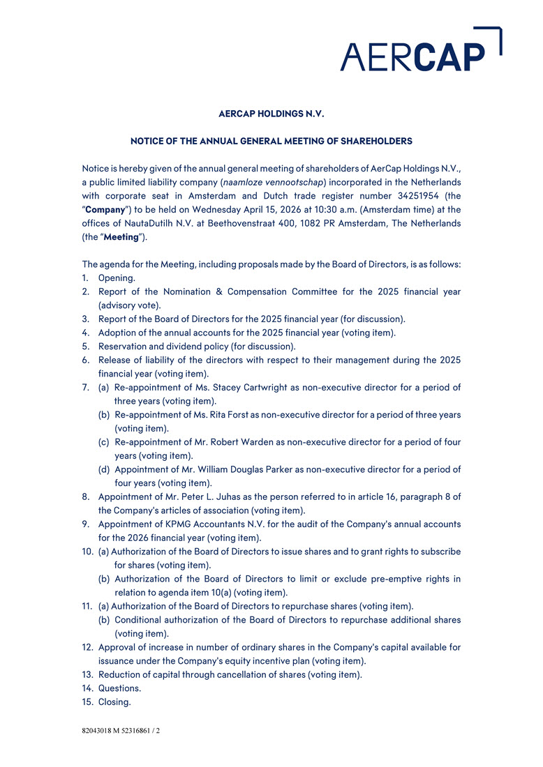 AERCAP HOLDINGS N.V.年度股东大会通知特此通知AerCAP HOLDINGS N.V.年度股东大会,AerCAP HOLDINGS N.V.是一家在荷兰注册成立的公共有限责任公司(NAAMLOZE VINOTSChap),公司所在地为阿姆斯特丹,荷兰贸易登记处编号为34251954(“公司”),将于2026年4月15日(星期三)上午10:30(阿姆斯特丹时间)在NautaDutilh N.V.的办公室举行,地址为Beethovenstraat 400,1082 PR Amsterdam,the Netherlands(“会议”)。会议议程,包括董事会提出的提案如下:1。开幕。2.提名与薪酬委员会关于2025财政年度的报告(咨询投票)。3.2025财年董事会报告(供讨论)。4.通过2025财政年度年度决算(表决项目)。5.保留和股息政策(供讨论)。6.解除董事于2025财政年度有关其管理层的责任(表决项目)。7.(a)续聘Stacey Cartwright女士为非执行董事,任期三年(表决项目)。(b)续聘Rita Forst女士为非执行董事,任期三年(表决项目)。(c)续聘Robert Warden先生为非执行董事,任期四年(表决项目)。(d)委任William Douglas Parker先生为非执行董事,任期四年(表决项目)。8.任命Peter L. Juhas先生为公司章程第16条第8款所指人员(表决项目)。9.委任毕马威会计师事务所(KPMG Accountants N.V.)审计公司2026财政年度的年度账目(表决项目)。10.(a)授权董事会发行股份及授出认购股份的权利(表决项目)。(b)授权董事会限制或排除与议程项目10(a)(表决项目)有关的优先购买权。11.(a)授权董事会回购股份(表决事项)。(b)董事会有条件授权回购额外股份(表决项目)。12.批准增加公司股权激励计划可供发行股本中的普通股数量(表决事项)。13.通过注销股份减资(表决事项)。14.问题。15.收盘。