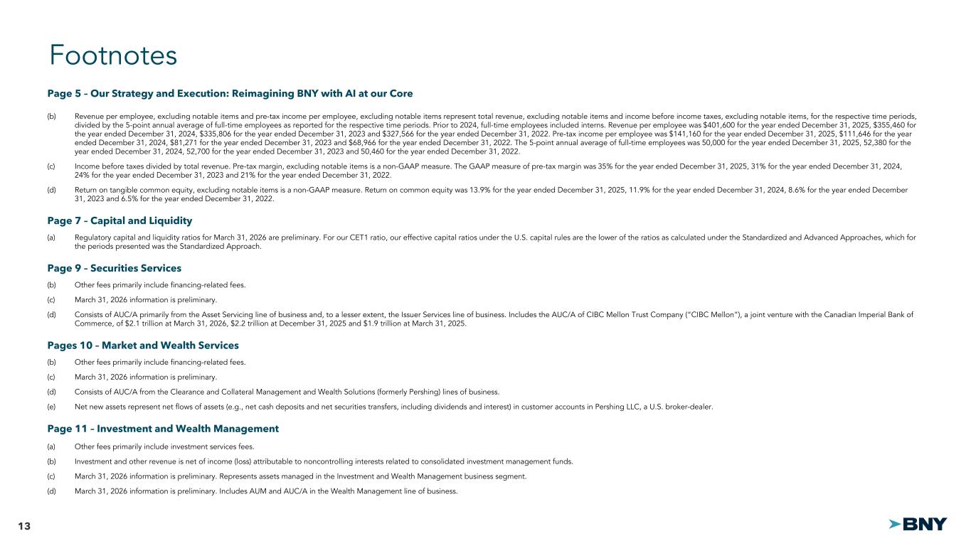 13脚注第5页–我们的战略和执行:以人工智能为核心重新构想纽约银行(b)每位员工的收入,不包括显着项目和每位员工的税前收入,不包括显着项目代表总收入,不包括显着项目和所得税前收入,不包括显着项目,在各个时间段,除以在各个时间段报告的全职员工的5个点的年平均值。2024年之前,全职员工包括实习生。截至2025年12月31日止年度,每名雇员的收入为401,600美元,截至2024年12月31日止年度为355,460美元,截至2023年12月31日止年度为335,806美元,截至2022年12月31日止年度为327,566美元。截至2025年12月31日止年度,每名雇员的税前收入为141,160美元,截至2024年12月31日止年度为111,646美元,截至2023年12月31日止年度为81,271美元,截至2022年12月31日止年度为68,966美元。截至2025年12月31日止年度,全职雇员的年平均人数为50000人,截至2024年12月31日止年度为52380人,截至2023年12月31日止年度为52700人,截至2022年12月31日止年度为50460人。(c)税前收入除以总收入。税前利润率,不包括值得注意的项目是一个非GAAP衡量标准。截至2025年12月31日止年度的税前利润率GAAP衡量标准为35%,截至2024年12月31日止年度为31%,截至2023年12月31日止年度为24%,截至2022年12月31日止年度为21%。(d)有形普通股权益回报率,不包括值得注意的项目是一种非公认会计准则衡量标准。截至2025年12月31日止年度的普通股本回报率为13.9%,截至2024年12月31日止年度为11.9%,截至2023年12月31日止年度为8.6%,截至2022年12月31日止年度为6.5%。第7页–资本和流动性(a)2026年3月31日的监管资本和流动性比率是初步的。对于我们的CET1比率,我们在美国资本规则下的有效资本比率是在标准化和高级方法下计算的比率中的较低者,对于所介绍的期间是标准化方法。第9页–证券服务(b)其他费用主要包括融资相关费用。(c)2026年3月31日信息为初步信息。(d)包括主要来自资产服务业务线的AUC/A,以及在较小程度上来自发行人服务业务线的AUC/A。包括与加拿大帝国商业银行的合资企业CIBC Mellon Trust Company(“CIBC Mellon”)截至2026年3月31日的AUC/A为2.1万亿美元,截至2025年12月31日为2.2万亿美元,截至2025年3月31日为1.9万亿美元。第10页–市场和财富服务(b)其他费用主要包括与融资相关的费用。(c)2026年3月31日信息为初步信息。(d)由清算和抵押品管理和财富解决方案(原潘兴)业务线的AUC/A组成。(e)净新资产指美国经纪交易商Pershing LLC客户账户中的资产净流动(例如现金存款净额和证券转账净额,包括股息和利息)。第11页–投资及财富管理(a)(a)其他费用主要包括投资服务费。(b)投资及其他收入扣除与综合投资管理基金有关的非控制性权益应占收益(亏损)。(c)2026年3月31日信息为初步信息。代表投资及财富管理业务分部管理的资产。(d)2026年3月31日信息初步。将AUM和AUC/A纳入财富管理业务条线。
