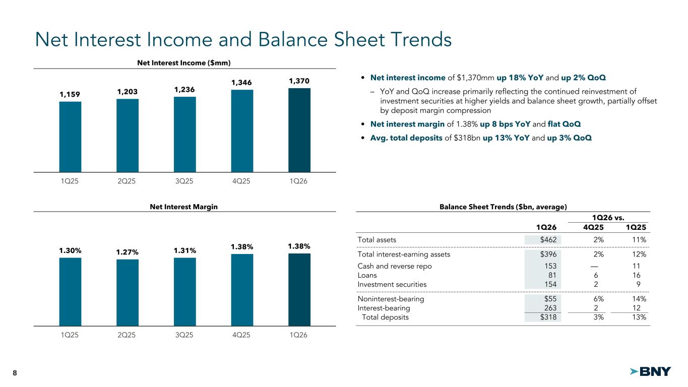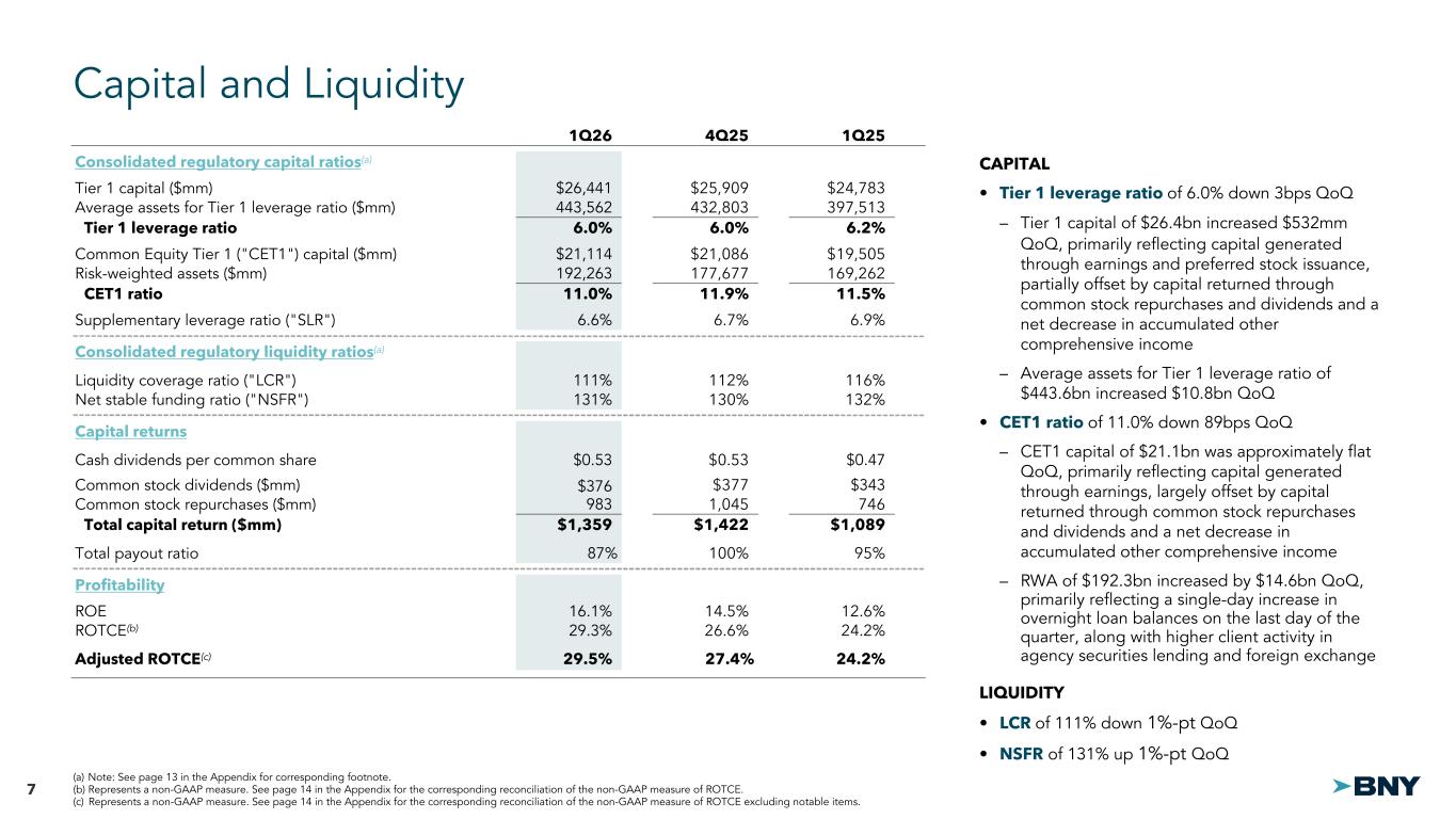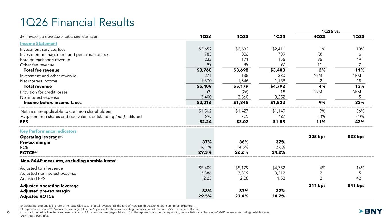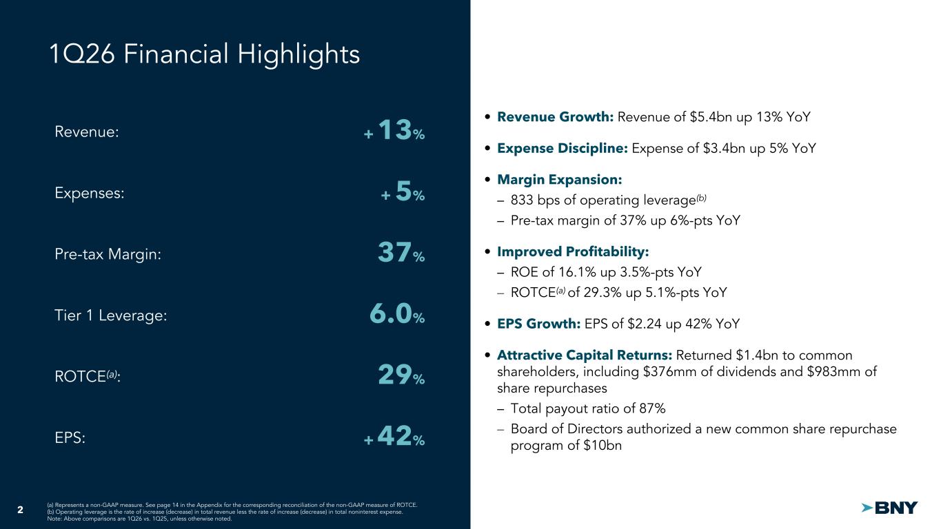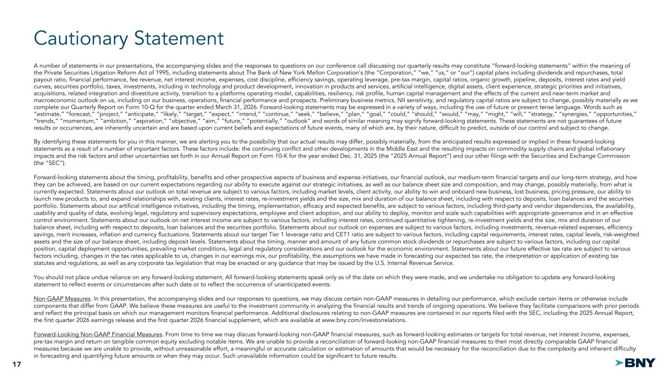 17我们在演示文稿中的一些陈述、随附的幻灯片以及在电话会议上对讨论我们季度业绩的问题的回答可能构成1995年《私人证券诉讼改革法案》含义内的“前瞻性陈述”,包括关于纽约梅隆银行公司(“公司”、“我们”、“我们”、或“我们的”)资本计划,包括股息和回购、总派息率、财务业绩、费用收入、净利息收入、费用、成本纪律、效率节约、经营杠杆、税前利润率、资本比率、有机增长、管道、存款、利率和收益率曲线、证券投资组合、税收、投资,包括在技术和产品开发、产品和服务创新、人工智能、数字资产、客户体验、战略优先事项和举措、收购、相关整合和剥离活动、向平台运营模式过渡、能力、弹性、风险状况、人力资本管理以及当前和近期市场和宏观经济前景对我们的影响,包括我们的业务、运营、财务业绩和前景。初步业务指标、NII敏感性和监管资本比率可能会发生变化,可能在我们完成截至2026年3月31日的季度10-Q表格季度报告时发生重大变化。前瞻性陈述可以用多种方式表达,包括使用将来时或现在时语言。“估计”、“预测”、“项目”、“预期”、“可能”、“目标”、“预期”、“打算”、“继续”、“寻求”、“相信”、“计划”、“目标”、“可能”、“应该”、“将”、“可能”、“可能”、“将”、“战略”、“协同效应”、“机遇”、“趋势”、“势头”、“雄心”、“抱负”、“目标”、“未来”、“潜在”、“展望”等词语以及类似含义的词语可能意味着前瞻性陈述。这些陈述不是对未来结果或事件的保证,本质上是不确定的,并且基于当前的信念和对未来事件的预期,其中许多就其性质而言,难以预测,超出了我们的控制范围,可能会发生变化。通过以这种方式为您识别这些陈述,我们提醒您,由于一些重要因素,我们的实际结果可能与这些前瞻性陈述中明示或暗示的预期结果存在重大差异,甚至可能存在重大差异。这些因素包括:中东的持续冲突和其他事态发展以及由此对商品供应链的影响和全球通胀影响,以及我们在截至2025年12月31日止年度的10-K表格年度报告(“2025年年度报告”)和我们向美国证券交易委员会(“SEC”)提交的其他文件中列出的风险因素和其他不确定性。关于业务和费用举措的时机、盈利能力、收益和其他预期方面、我们的财务前景、我们的中期财务目标和我们的长期战略以及如何实现这些目标的前瞻性陈述是基于我们目前对我们执行战略举措的能力的预期,以及我们的资产负债表规模和构成,并且可能会与目前的预期发生重大变化,可能会发生重大变化。关于我们总收入前景的声明受各种因素的影响,包括市场水平、客户活动、我们赢得和加入新业务的能力、失去的业务、定价压力、我们向现有客户推出新产品并扩大与其关系的能力、利率、再投资收益率以及我们资产负债表的规模、组合和期限,包括存款、贷款余额和证券投资组合。关于我们的人工智能举措的声明,包括时间安排、实施、功效和预期收益,受各种因素的影响,包括第三方和供应商依赖关系、数据的可用性、可用性和质量、不断变化的法律、监管和监督期望、员工和客户的采用,以及我们通过适当治理和在有效控制环境中部署、监测和扩展此类能力的能力。关于我们对净利息收入前景的陈述受各种因素的影响,包括利率、持续的量化紧缩、再投资收益率以及我们资产负债表的规模、组合和持续时间,包括存款、贷款余额和证券投资组合。关于我们的费用前景的声明受各种因素的影响,包括投资、与收入相关的费用、效率节约、绩效提高、通货膨胀和货币波动。关于我们的目标一级杠杆率和CET1比率的声明受到各种因素的影响,包括资本要求、利率、 资本水平、风险加权资产和我们的资产负债表规模,包括存款水平。关于任何未来普通股股息或回购的时间、方式和金额的声明受各种因素的影响,包括我们的资本状况、资本部署机会、当前市场状况、法律和监管考虑以及我们对经济环境的展望。关于我们未来有效税率的声明受各种因素的影响,包括适用于我们的税率变化、我们的收益组合变化、我们的盈利能力、我们在预测我们的预期税率时所做的假设、对现有税收法规和条例的解释或应用,以及可能颁布的任何公司税收立法或美国国税局可能发布的任何指导。你不应该过分依赖任何前瞻性陈述。所有前瞻性陈述仅在作出之日发表,我们不承担更新任何前瞻性陈述以反映该日期之后的事件或情况或反映意外事件发生的义务。非GAAP措施。在本演示文稿、随附的幻灯片和我们对问题的回答中,我们可能会在详细说明我们的业绩时讨论某些非公认会计原则措施,这些措施不包括某些项目或以其他方式包括与公认会计原则不同的组成部分。我们认为,这些措施有助于投资界分析持续运营的财务结果和趋势。我们认为,它们有助于与前期进行比较,并反映了我们管理层监控财务业绩的主要基础。与非公认会计原则措施有关的其他披露载于我们向SEC提交的报告,包括2025年年度报告、2026年第一季度收益发布和2026年第一季度财务补充,可在www.bny.com/investorrelations上查阅。前瞻性非GAAP财务指标。我们可能会不时讨论前瞻性的非GAAP财务指标,例如总收入、净利息收入、费用、税前利润率和有形普通股本回