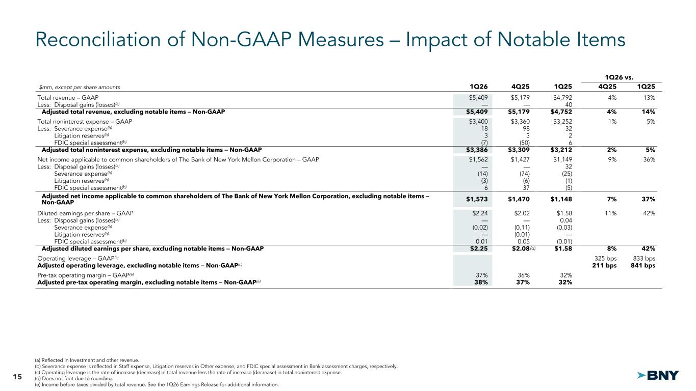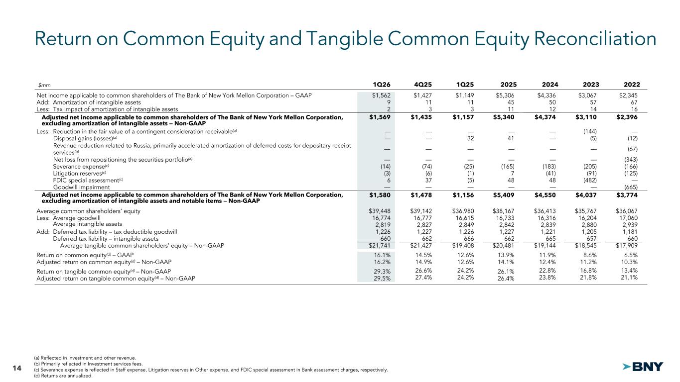 14 $ mm 1Q26 4Q25 1Q25 2025202420232022适用于纽约梅隆银行公司普通股股东的净收入– GAAP 1,562美元1,427美元1,149美元5,306美元4,336美元3,067美元2,345加:无形资产摊销9111145505767减:无形资产摊销的税收影响23311121416适用于纽约梅隆银行公司普通股股东的调整后净收入,不包括无形资产摊销——非美国通用会计准则1569美元1435美元1157美元5340美元4374美元3110美元2396美元减:应收或有对价公允价值减少(a)————(144)——处置收益(损失)(a)—— 3241 ——(5)(12)与俄罗斯有关的收入减少,存托凭证服务递延成本的主要加速摊销(b)——————(67)重新定位证券组合的净亏损(a)——————(343)减:遣散费(c)(14)(74)(25)(165)(183)(205)(166)减:诉讼准备金(c)(3)(6)(1)7(41)(91)(125)减:FDIC特别评估(c)637(5)4848(482)—商誉减值————(665)适用于纽约梅隆银行公司普通股股东的调整后净收益,不包括无形资产摊销和值得注意的项目——非美国通用会计准则1,580美元1,478美元1,156美元5,409美元4,550美元4,037美元3,774美元平均普通股股东权益39,448美元39,142美元36,980美元38,167美元36,413美元35,767美元36,067美元减:平均商誉16,77416,77716,61516,73316,31616,20417,060减:平均无形资产2,8192,8272,8492,8422,8392,8802,939加:递延所得税负债–可扣税商誉1,2261,2271,2271,2211,2051,181加:递延所得税负债–无形资产6606626666666665665657660平均有形普通股经调整普通股权益回报率(d)– Non-GAAP 16.2% 14.9% 12.6% 14.1% 12.4% 11.2% 10.3%有形普通股权益回报率(d)– Non-GAAP 29.3% 26.6% 24.2% 26.1% 22.8% 16.8% 13.4%经调整有形普通股权益回报率(d)– Non-GAAP 29.5% 27.4% 24.2% 26.4% 23.8% 21.8% 21.1%普通股权益回报率和有形普通股权益调节(a)反映在投资和其他收入中。(b)主要体现在投资服务费上。(c)遣散费分别反映在员工费用、其他费用中的诉讼准备金和银行评估费用中的FDIC特别评估中。(d)回报按年计算。