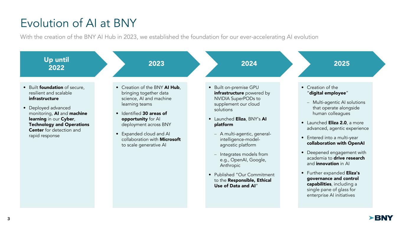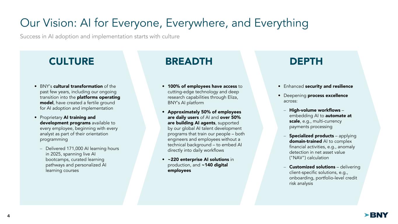 5303033362022202320242025中期21.12 1.82 3.8 26.42022202320242025中期产出预期交易创新STREAMLINININGONBOARDING~截至2025年,任何年度账户计划的50%是使用人工智能起草的~2025年客户账户计划完成的速度比2024年快60%~25%的新入职支持的人工智能流程在2016年第一季度>公司客户某些入职流程在2016年第一季度完成的速度比2015年第一季度快20%~限制性方筛选的70%对于通过AI审查的付款>在通过AI审查时解决受限制方筛查的速度加快30% >截至2016年第一季度AI处理的托管结算交易状态查询的速度加快10% >在2016年第一季度与2015年第一季度相比,通过AI处理的结算查询的速度加快80% > 2016年第一季度AI编写的代码的速度加快40% > 2016年第一季度与25年第一季度相比软件发布增加10% 338美元339美元355美元40120222022202320242025美元99美元103美元116美元14320222023202320242025我们的战略和执行:以我们的核心广度用AI重新构想纽约银行采用的深度使我们能够在整个公司的工作流程中深度集成人工智能每名员工的盈利能力收入(a)(b)($‘000)(不包括值得注意的项目)每名员工的税前收入(a)(b)($’000)(不包括值得注意的项目)税前利润率(a)(c)(%)(不包括值得注意的项目)ROTCE(a)(d)(%)(不包括值得注意的项目)38 +/-28 +/-可扩展性生产力投入我们重新构想BNY的工作正在显示结果,并且将越来越多地通过AI(a)代表一种非公认会计准则衡量标准。有关不包括值得注意的项目的非GAAP措施的相应调节,请参见附录第14页和第16页。(e)代表前瞻性的非GAAP财务指标。有关前瞻性非GAAP财务指标的信息,请参见第17页的“警示性声明”。注:相应脚注见附录第13页。中期指3-5年期限。(e)(e)实例: