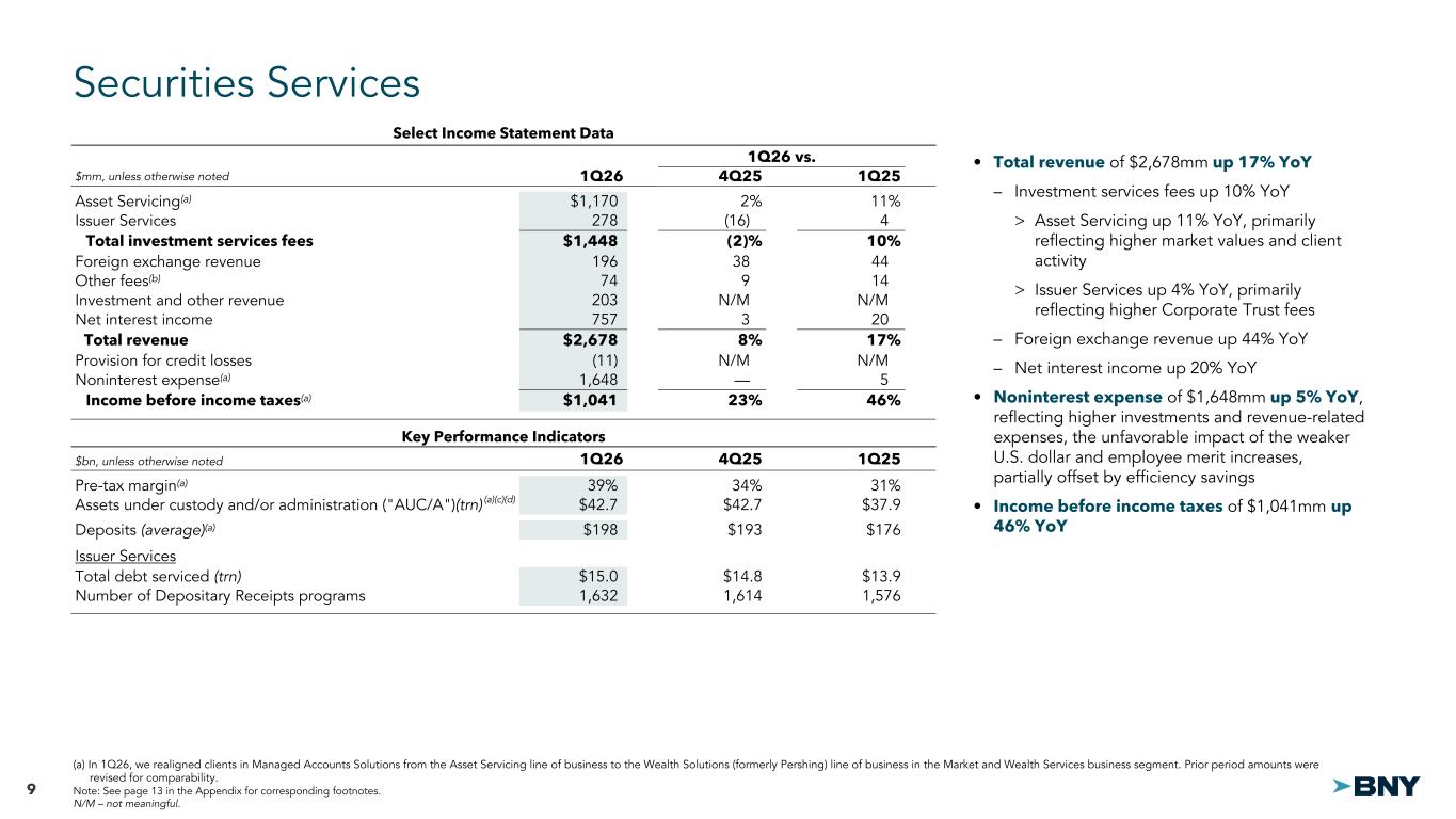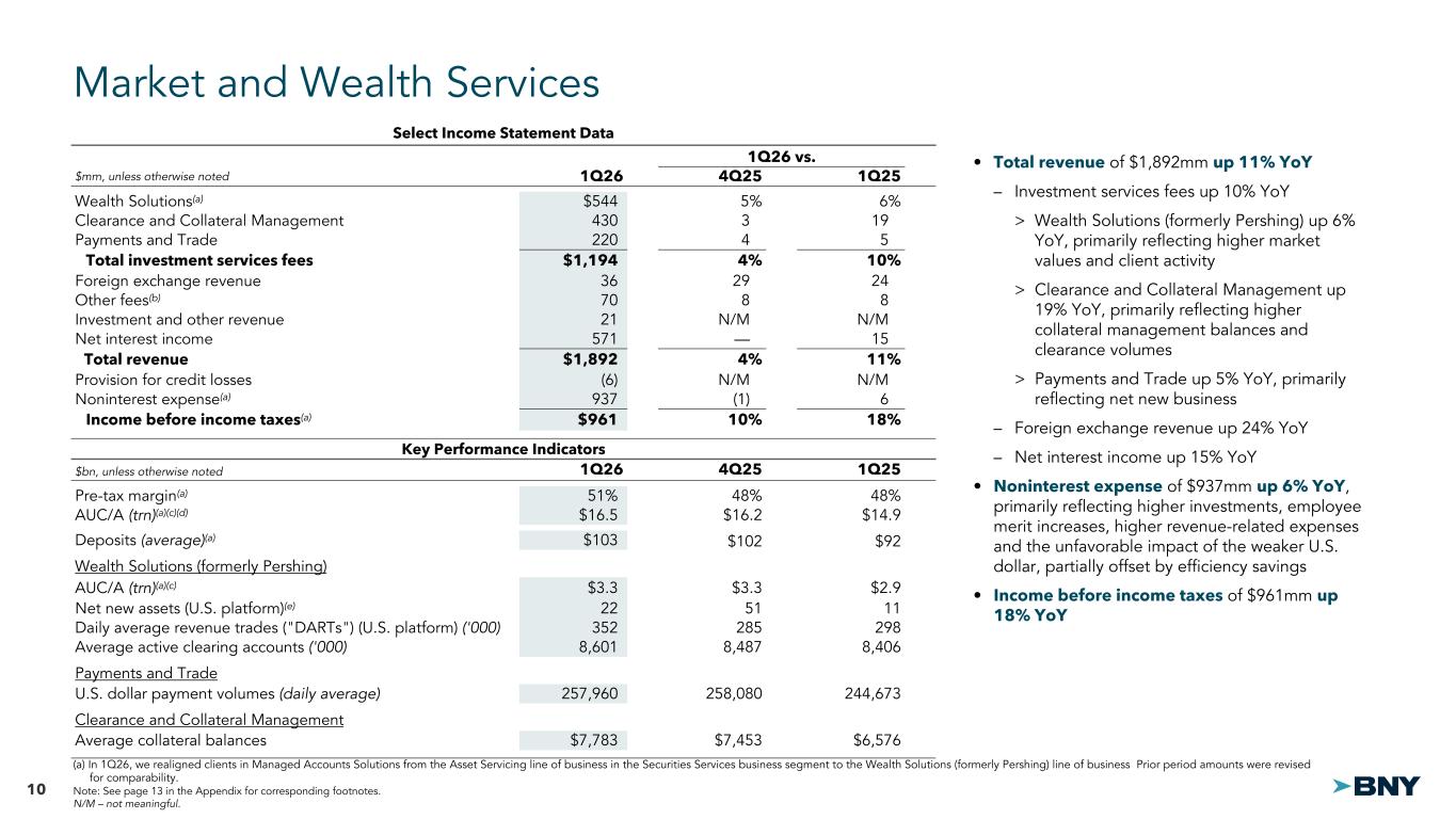 9 1Q26 vs. $ mm,除非另有说明1Q26 4Q25 1Q25 Asset Servicing(a)$ 1,1702% 11% Issuer Services 278(16)4总投资服务费$ 1,448(2)% 10%外汇收入1963844其他费用(b)74914投资和其他收入203 N/m N/m净利息收入757320总收入$ 2,6788% 17%信贷损失准备金(11)N/m N/m非利息费用(a)1,648 — 5所得税前收入(a)$ 1,04123% 46% bn,除非另有说明,1Q26 4Q25 1Q25税前利润率(a)39% 34% 31%托管和/或管理下的资产(“AUC/A”)(trn)$ 42.7 $ 42.7 $ 37.9存款(平均)(a)$ 198 $ 193 $ 176发行人服务已偿还债务总额(trn)$ 15.0 $ 14.8 $ 13.9存托凭证计划数量1,6321,6141,576证券服务Select Income报表数据选择收入Select Income报表数据关键业绩指标(a)(c)(d)•总收入2,678mm美元,同比增长17% –投资服务费同比增长10% >资产服务同比增长11%,主要反映了更高的市值和客户活动>发行人服务同比增长4%,主要反映企业信托费用增加–外汇收入同比增长44% –净利息收入同比增长20% •非利息费用为1,648美元,同比增长5%,反映投资和与收入相关的费用增加、美元走软的不利影响和员工绩效增加,部分被效率节约所抵消•所得税前收入为1,041美元,同比增长46%(a)在26年第一季度,我们将管理账户解决方案的客户从资产服务业务线调整为市场和财富服务业务部门的财富解决方案(原潘兴)业务线。上一期间的金额为可比性进行了xxx修订。注:相应脚注见附录第13页。N/m –没有意义。