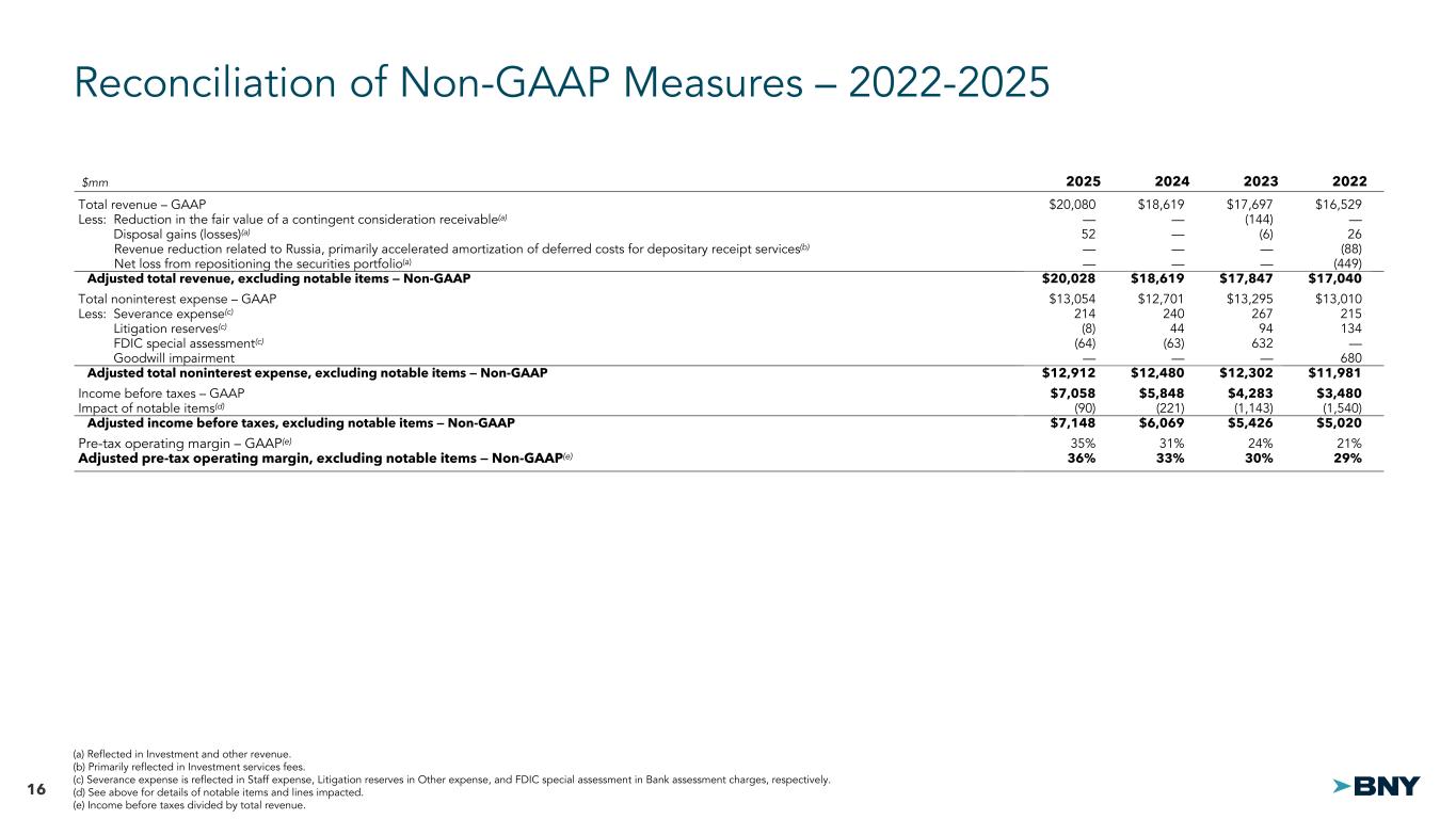 16非GAAP措施的Select Income报表数据调节– 2022-2025 $ mm 2025202420232022总收入– GAAP 20,080美元18,619美元17,697美元16,529美元减:应收或有对价公允价值减少(a)——(144)——减:处置收益(损失)(a)52 ——(6)26与俄罗斯有关的收入减少,主要是存托凭证服务递延成本的加速摊销(b)——(88)重新定位证券组合的净亏损(a)——(449)调整后的总收入,不包括值得注意的项目——非美国通用会计准则20,028美元18,619美元17,847美元17,040美元非利息费用总额——美国通用会计准则13,054美元12,701美元13,295美元13,010美元减:遣散费(c)214240267215减:诉讼准备金(c)(8)4494134减:FDIC特别评估(c)(64)(63)632 —减:商誉减值—— 680调整后的非利息费用总额,不包括值得注意的项目——非美国通用会计准则12,912美元12,480美元12,302美元11,981美元税前收入——美国通用会计准则7,058美元5,848美元4,283美元3,480美元值得注意的项目(d)(90)(221)(1,143)(1不包括值得注意的项目——非GAAP 7,148美元6,069美元5,426美元5,020美元税前营业利润率—— GAAP(e)35% 31% 24% 21%调整后税前营业利润率,不包括值得注意的项目——非GAAP(e)36% 33% 30% 29%(a)反映在投资和其他收入中。(b)主要体现在投资服务费上。(c)遣散费分别反映在员工费用、其他费用中的诉讼准备金和银行评估费用中的FDIC特别评估中。(d)有关受影响的值得注意的项目和项目的详细信息,请参见上文。(e)税前收入除以总收入。