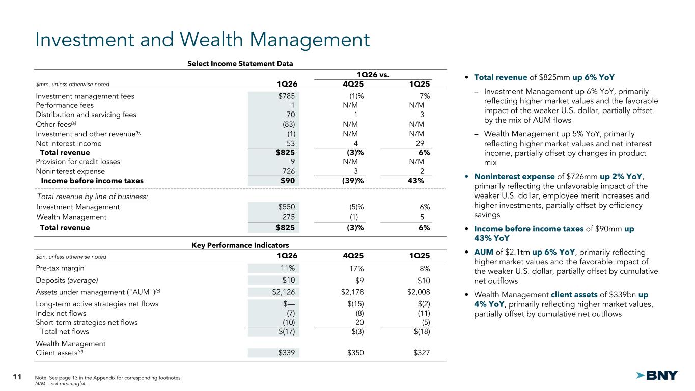 10 1Q26 vs. $ mm,除非另有说明1Q26 4Q25 1Q25 Wealth Solutions(a)$ 5445% 6% Clearance and Collateral Management 430319 Payments and Trade 22045总投资服务费$ 1,1944% 10%外汇收入362924其他费用(b)7088投资和其他收入21 N/M N/M净利息收入571 — 15总收入$ 1,892.4% 11%信贷损失准备金(6)N/M N/M非利息费用(a)937(1)6所得税前收入(a)$ 961 10% 18% $ bn,除非另有说明1Q26 4Q25 1Q25税前利润率(a)51% 48% 48% AUC/A(trn)(a)(c)(d)$ 16.5 $ 16.2 $ 14.9存款(平均)(a)$ 103 $ 102 $ 92 Wealth Solutions(前Pershing)AUC/A(trn)(a)(c)$ 3.3 $ 3.3 $ 2.9净新资产(美国平台)(e)225111日均收入交易(“DART”)(美国平台)(‘000)352285298平均活跃清算账户(’000)8,6018,4878,406支付和贸易美元支付量(日均)257,960258,080244,673清算和抵押品管理平均抵押品余额$ 7,783 $ 7,453 $ 6,576市场和Wealth Services Select Income报表数据关键业绩指标丨丨期内收入丨表内数据•总收入1,892mm,同比增长11% –投资服务费同比增长10% > Wealth Solutions(前身为Pershing)同比增长6%,主要反映市值和客户活动增加>清仓和抵押品管理同比增长19%,主要反映抵押品管理余额和清盘量增加>支付和贸易同比增长5%,主要反映净新业务–外汇收入同比增长24% –净利息收入同比增长15% •非利息支出937mm,同比增长6%,主要反映投资增加、员工绩效增加、与收入相关的费用增加以及美元走软的不利影响,部分被效率节约所抵消•所得税前收入为961mm美元,同比增长18%(a)在26年第一季度,我们将托管账户解决方案的客户从证券服务业务部门的资产服务业务线调整为财富解决方案(原潘兴)业务线上期金额为可比性修订了xxx。注:相应脚注见附录第13页。不适用–没有意义。