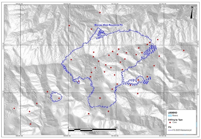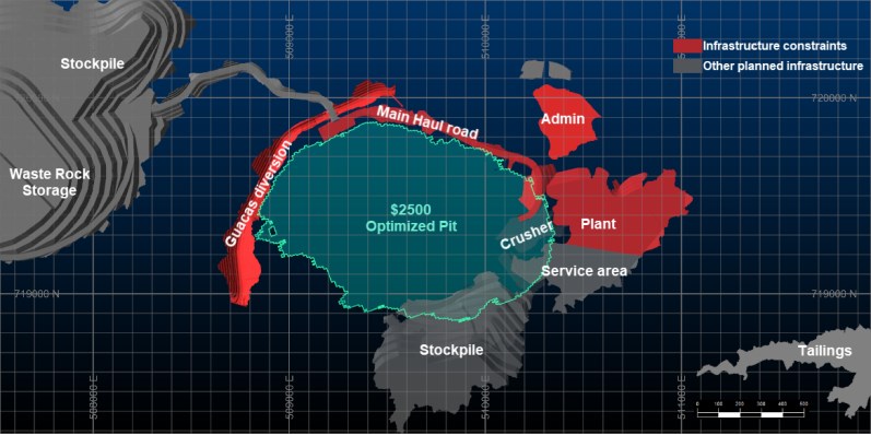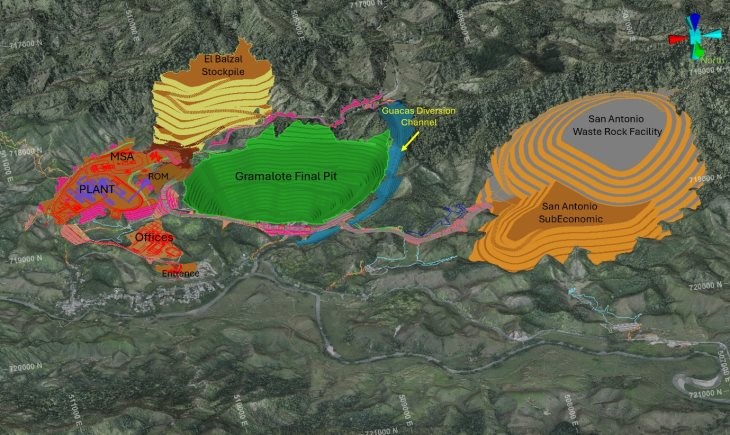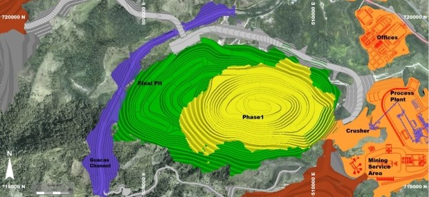 2025年可行性研究设想的主要基础设施包括:一个露天矿坑;分两期开采;废石储存设施、库存、引水包括Guacas Creek引水;工艺厂房:粉磨、浮选和浸出设施、管理和工程办公室、换房、车间、仓库和铺设设施、电网开关设备变电站;矿山设施:重型设备车间、仓库、燃料储存、燃料分配舱、洗涤舱、轮胎舱、焊接厂、化验实验室、换房、食堂、炸药库、爆炸物中转厂、混凝土批厂;内部矿山道路,包括拖运道路;一条通往Cristales村的社区绕行道路;矿井入口和营地住宿;Guacas Creek和水处理厂的取水口、泥沙治理池;采石场借坑;一个TMF;和公用事业。