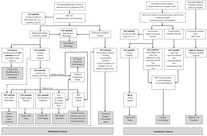 冶金测试工作和相关分析程序适用于矿化类型,适用于建立概念加工路线,并使用典型矿化类型的样品进行。