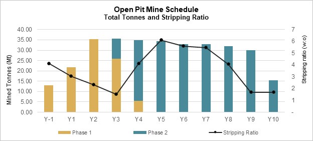 预计最高提取率为35mt/a,含预剥采期的LOM为11年。在主动采矿停止后,加工将再持续两年。整体带钢比预测为3.1:1(废:矿)。