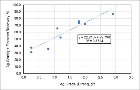 估计的恢复因素是基于适当的冶金测试工作。在金头品位为1.0克/吨AU的情况下,整体黄金回收率将为95.5%。在1.0克/吨Ag的银头品位下,整体白银回收率将为38.0%。不适用工厂回收折扣。