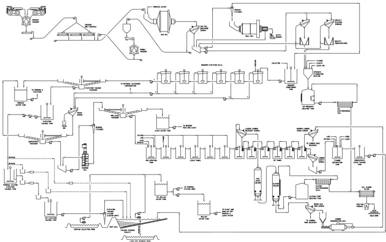 该工艺装置将由单级一次破碎、闭路二次(干)筛和二次圆锥破碎、带HPGR(湿)筛闭路的单级HPGR和带旋风筒闭路的球磨机组成,以达到目标产品尺寸。它将包括一个带有离心重力集中器的重力回路和一个密集的氰化浸出反应器。浮选区将包括浮选回路、浮选精矿浓缩机、垃圾筛和回磨回路、预浸浓缩机、精矿浸出回路。黄金电路将由CIP和压力Zadra电路组成。