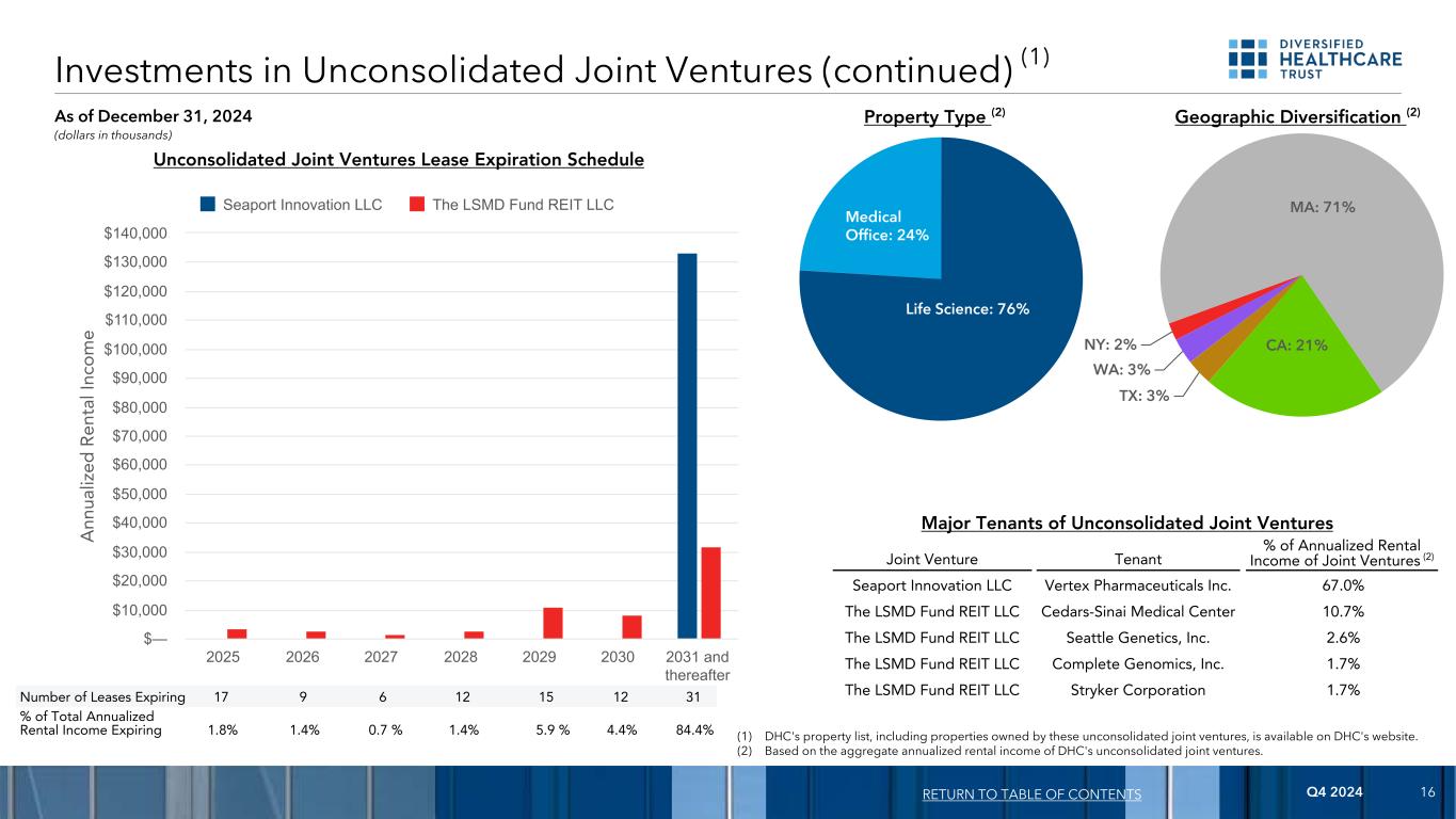 2024年第4季度16对未合并合资企业的投资(续)(1)(单位:千美元)截至2024年12月31日的目录回报(1)DHC的财产清单,包括这些未合并合资企业拥有的财产,可在DHC的网站上查阅。(2)以DHC未并表合营企业的合计年化租金收入为基数。A nn ua liz ed r en ta l i nc om e Seaport Innovation LLC The LSMD Fund REIT LLC 2025202620272028202920302031其后$ — $ 10,000 $ 20,000 $ 30,000 $ 40,000 $ 50,000 $ 60,000 $ 70,000 $ 80,000 $ 90,000 $ 100,000 $ 110,000 $ 120,000 $ 130,000 $ 140,000 Unconsolidated Joint Ventures Lease Expiration Schedule Number of leases expiring 179612151231% of total annualized rent income expiring 1.8% 1.4% 0.7% 1.4% 5.9% 4.4% 84.4% Main Tenants of Unconsolidated Joint Ventures Joint Tenant % of Annualized Rent Income of Joint Ventures(2)Seaport Innovation LLC 福泰制药 Inc. 67.0% The LSMD Fund REIT LLC Cedars-Sinai Medical CenterInc. 2.6% LSMD Fund REIT LLC Complete基因 1.7% LSMD Fund REIT LLC 史赛克公司 1.7% Life Science:76% Medical Office:24% Property Type(2)MA:71% 加利福尼亚州:21% TX:3% WA:3% NY:2% Geographic Diversification(2)