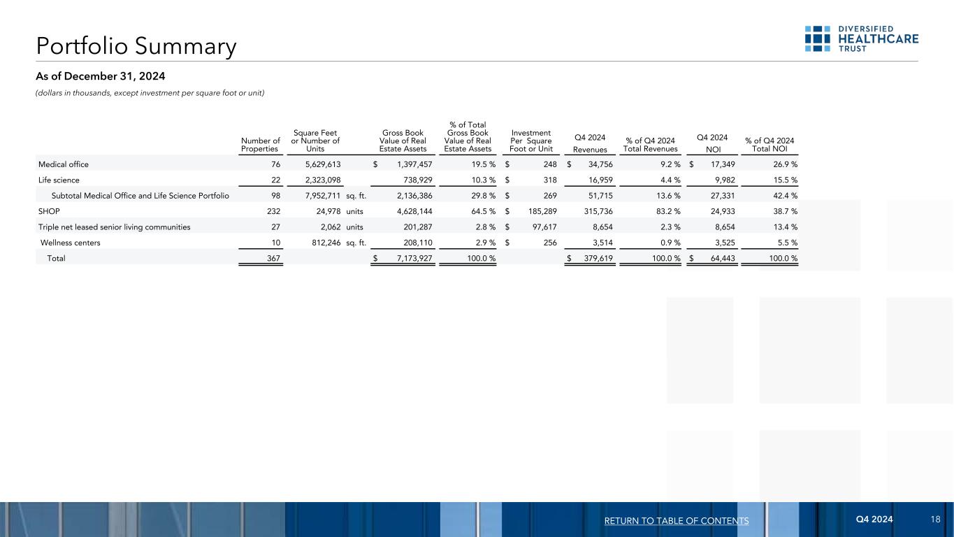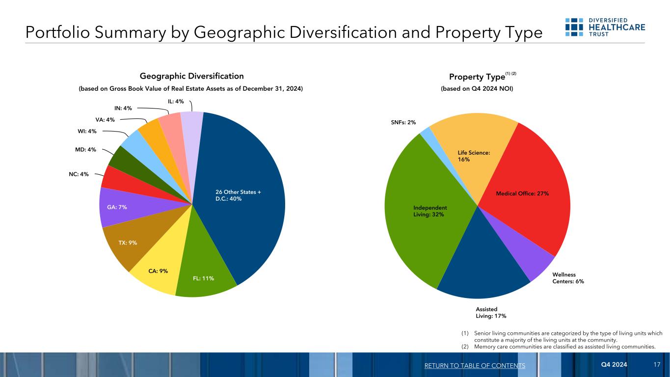 Q1 2024 17 FL:11% 加利福尼亚州:9% TX:9% GA:7% NC:4% MD:4% WI:4% VA:4% IN:4% IL:4% 26其他州+ DC:40%(基于截至2024年12月31日的房地产资产账面总值)(1)老年生活社区按构成社区大多数生活单元的生活单元类型分类。(二)记忆关怀社区划为辅助生活社区。按地理多元化和物业类型划分的投资组合摘要地理多元化回归目录辅助生活医疗:17%独立生活:32% SNFs:2%生命科学:16%医疗办公室:27%健康中心:6%物业类型(1)(2)(基于2024年Q4 NOI)