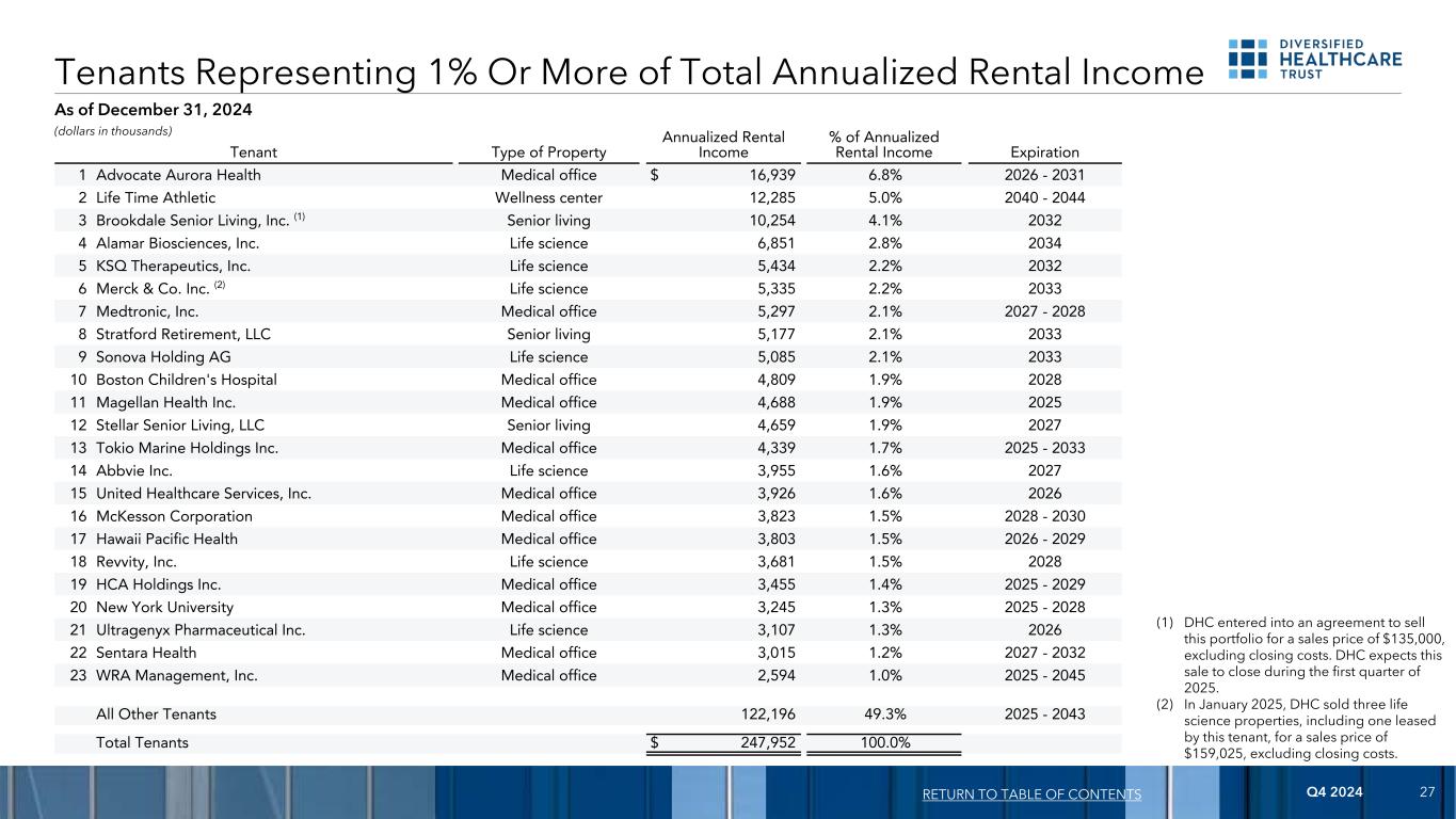 2024年第四季度27截至12月31日,2024年占年化租金收入总额1%或以上的租户向目录的回报(单位:千美元)租户物业类型年化租金收入占年化租金收入的百分比到期1 Advocate Aurora Health Medical Office $ 16,9396.8% 2026-20312 Life Time Athletic Wellness Center 12,2855.0% 2040-20443 布鲁克代尔高级护理,Inc.(1)老年生活10,2544.1% 20324 Alamar Biosciences,Inc. Life Science 6,8512.8% 20345 KSQTherapeutics,Inc. Life Science 5,4342.2% 20326 默沙东 & Co. Inc.(2)Life Science 5,3352.2% 20337丨美敦力公司美敦力公司 Medical Office 5,2972.1% 2027-20288 Stratford Retirement,LLC Senior Living 5,1772.1% 20339 Sonova Holding AG Life Science 5,0852.1% 203310 Boston Children's Hospital Medical Office 4,8091.9% 202811 麦哲伦健康服务丨Inc. Medical Office 4,6881.9% 202512 Stellar Senior Living,LLC Senior Living 4,6591.9% 202713 Tokio Marine Holdings Inc. Medical Office 4,3391.7% 2025-203314丨Abbvie Inc. 艾伯维公司丨Life Science 3,9551.6% 202715 United HealthcareInc. Medical Office 3,9261.6% 202616 McKesson Corporation Medical Office 3,8231.5% 2028-203017 Hawaii Pacific Health Medical Office 3,8031.5% 2026-202918 Revvity,Inc. Life Science 3,6811.5% 202819 HCA Holdings Inc. Medical Office 3,4551.4% 2025-202920 New York University Medical Office 3,2451.3% 2025-202821 ⑤ Life Science 3,1071.3% 202622 Sentara Health Medical Office 3,0151.2% 2027-203223 WRA Management,Inc. Medical Office 2,5941.0% 2025-2045所有其他租户122,19649.3% 2025-2043总租户$ 247,952100.0%(1)DHC签订协议,以135,000美元的销售价格出售该投资组合,不包括成交费用。DHC预计此次出售将在2025年第一季度完成。(2)2025年1月,DHC出售了三处生命科学物业,其中一处由该租户租赁,销售价格为159025美元,不包括关闭费用。