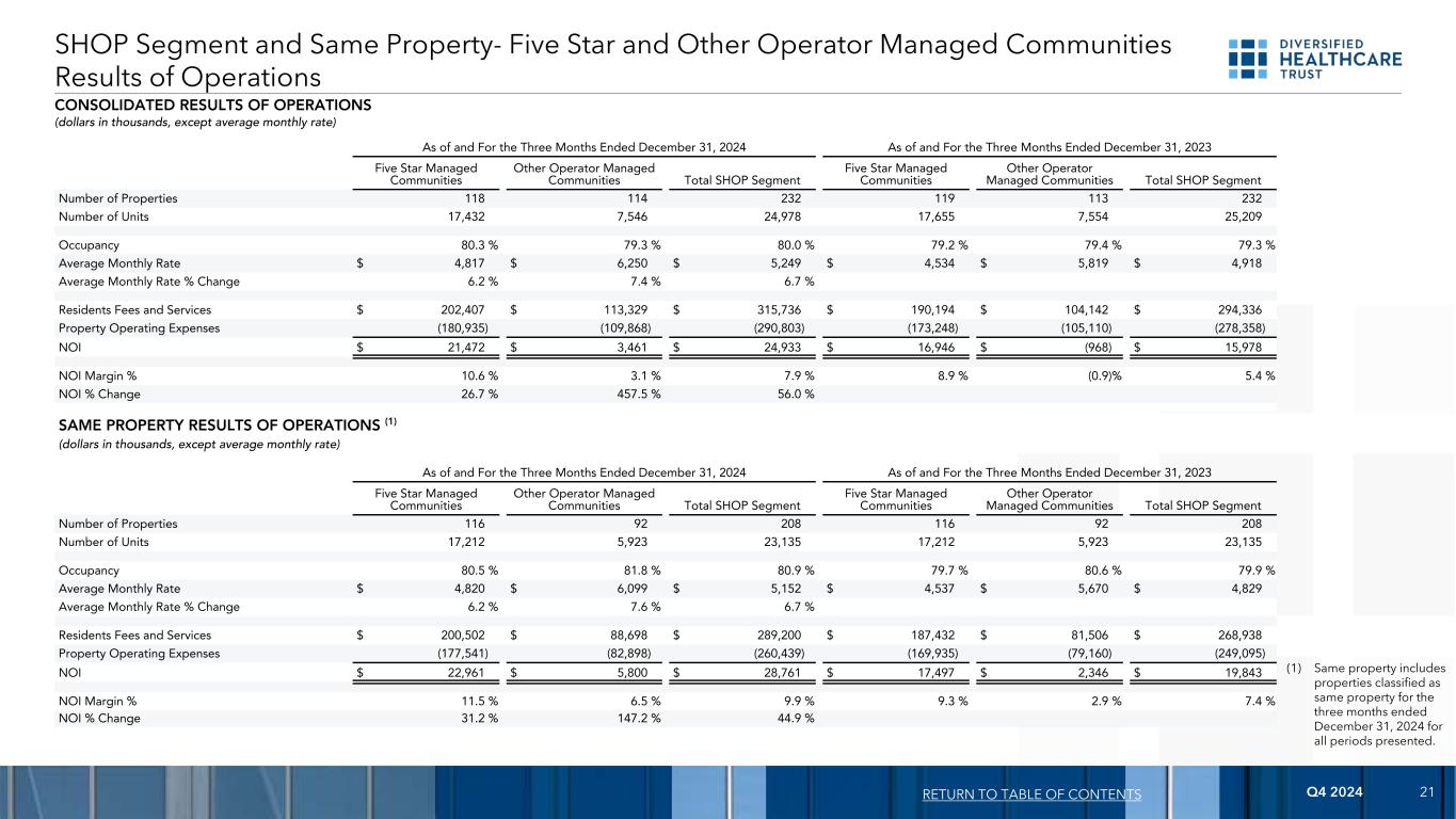 2024年第四季度21日截至2024年12月31日止三个月及截至12月31日止三个月的目录收益,2023五星管理社区其他运营商管理社区总店铺段五星管理社区其他运营商管理社区总店铺段物业数118114232119113232单位数17,4327,54624,97817,6557,55425,209入住率80.3% 79.3% 80.0% 79.2% 79.4% 79.3%平均月费率$ 4,817 $ 6,250 $ 5,249 $ 4,534 $ 5,819 $ 4,918平均月率%变化6.2% 7.4% 6.7%居民费用和服务$ 202,407 $ 113,329 $ 315,736 $ 190,194 $ 104,142 $ 294,336物业运营费用(180,935)(109,868)(290,803)(173,248)(105,110)(278,358)NOI $ 21,472 $ 3,461 $ 24,933 $ 16,946 $(968)$ 15,978 NOI Margin % 10.6% 3.1% 7.9% 8.9%(0.9)% 5.4% NOI % change 26.7% 457.5% 56.0% Same property results of operations(1)(dollars in thousand,except average monthly rate)截至2024年12月31日止三个月截至12月31日止三个月,2023五星管理社区其他运营商管理社区总店铺段五星管理社区其他运营商管理社区总店铺段物业数量1169220811692208单位数17,2125,92323,13517,2125,92323,135入住率80.5% 81.8% 80.9% 79.7% 80.6% 79.9%平均月费率$ 4,820 $ 6,099 $ 5,152 $ 4,537 $ 5,670 $ 4,829平均月率%变化6.2% 7.6% 6.7%居民费和服务$ 200,502 $ 88,698 $ 289,200 $ 187,432 $ 81,506 $ 268,938物业运营费用(177,541)(82,898)(260,439)(169,935)(79,160)(249,095)NOI $ 22,961 $ 5,800 $ 28,761 $ 17,497 $ 2,346 $ 19,843 NOI Margin % 11.5% 6.5% 9.9% 9.3% 2.9% 7.4% NOI % change 31.2% 147.2% 44.9% SHOP segment and Same Property-Five Star and Other Operator Managed Communities Results Consolidated Results of Operations(dollars in thousand,平均月费率除外)(1)同一物业包括截至2024年12月31日止三个月的所有呈报期间归类为同一物业的物业。